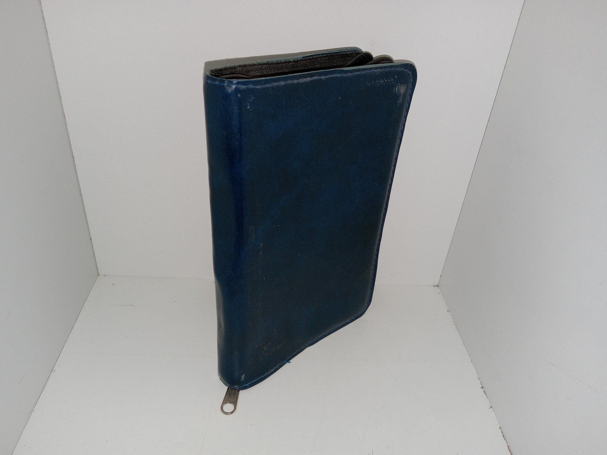 Fair condition book kept within a dark blue zipper case. The case has scuffing, and some small stains. The ribbon bookmark has some fraying. Some pages have wrinkling. The front inside cover has an inscription written in pen. The title page has a sizeable piece torn off, and some writing in pencil. Text and illustrations throughout are clear and legible.
