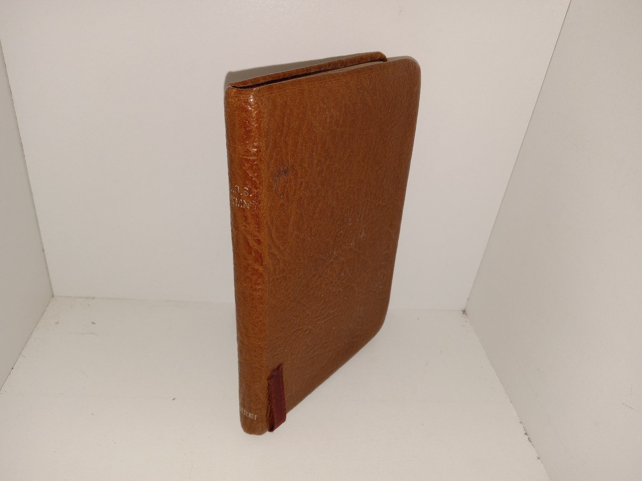 Good condition, small, thin, brown, leather-bound book. The cover has a couple small stains. The ribbon bookmark has some fraying on the tip. The front flyleaf has writing in pen. Some pages have creases. The title page has writing in pencil. Text and illustrations throughout are clear and legible.