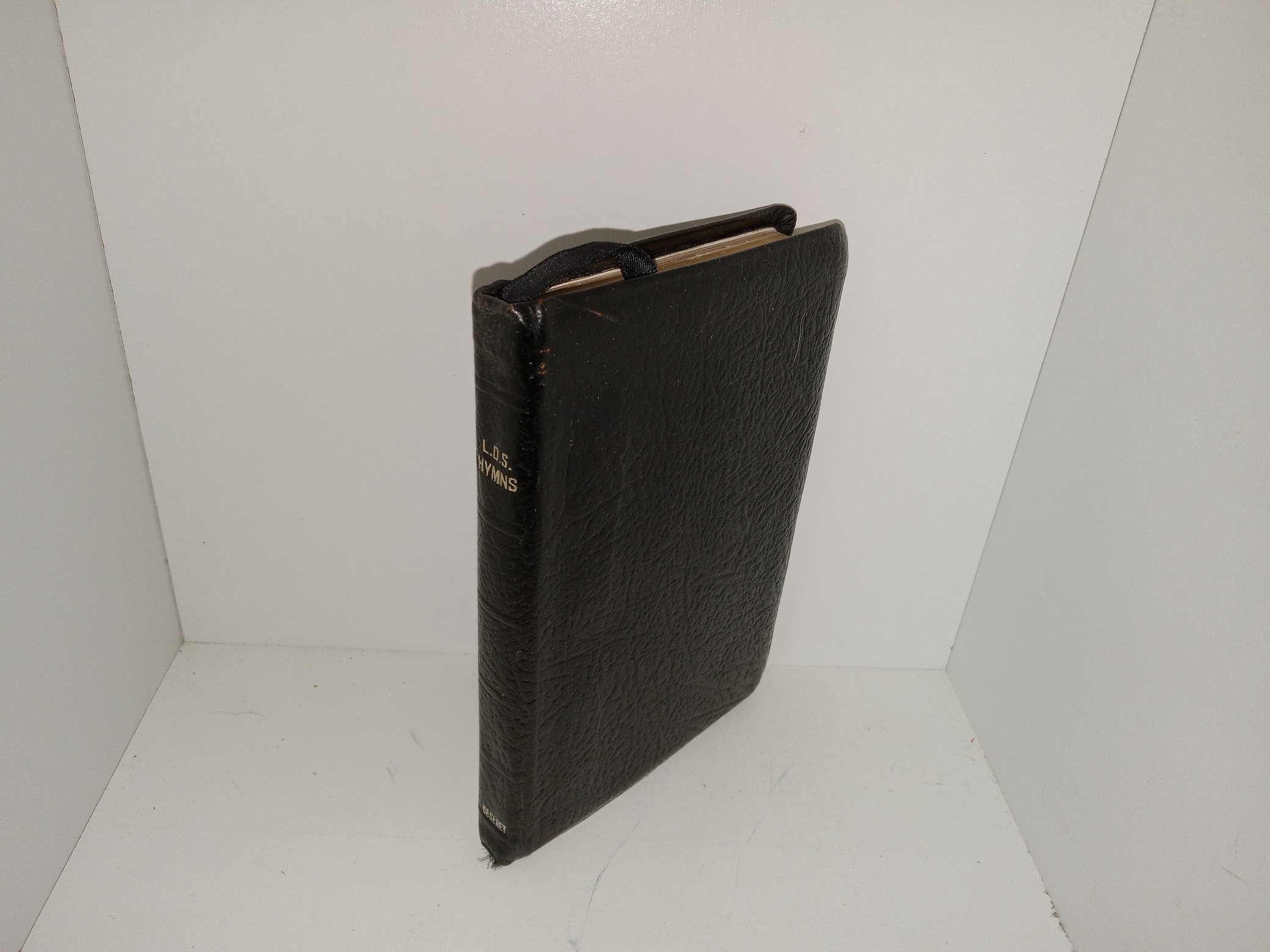 Fair-good condition, small, black, leather-bound book. The cover has a long scuff mark on the back. The ribbon bookmark has a frayed tip. Some pages have pen scribbles, or creases. The title page has writing in pencil.