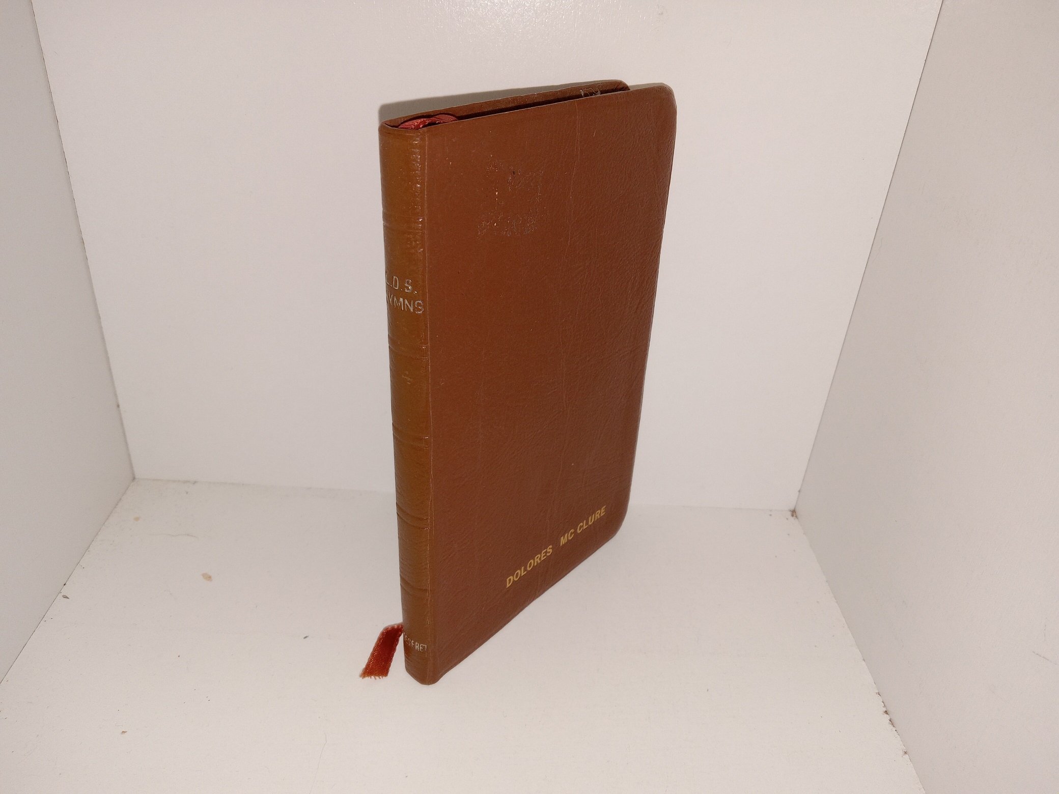 Good condition, small, thin, brown vinyl book. The cover has a patch of adhesive residue, some creasing, and the name of a previous owner engraved upon it. The title page has writing in pencil. Text and illustrations throughout are clean, clear, and legible.
