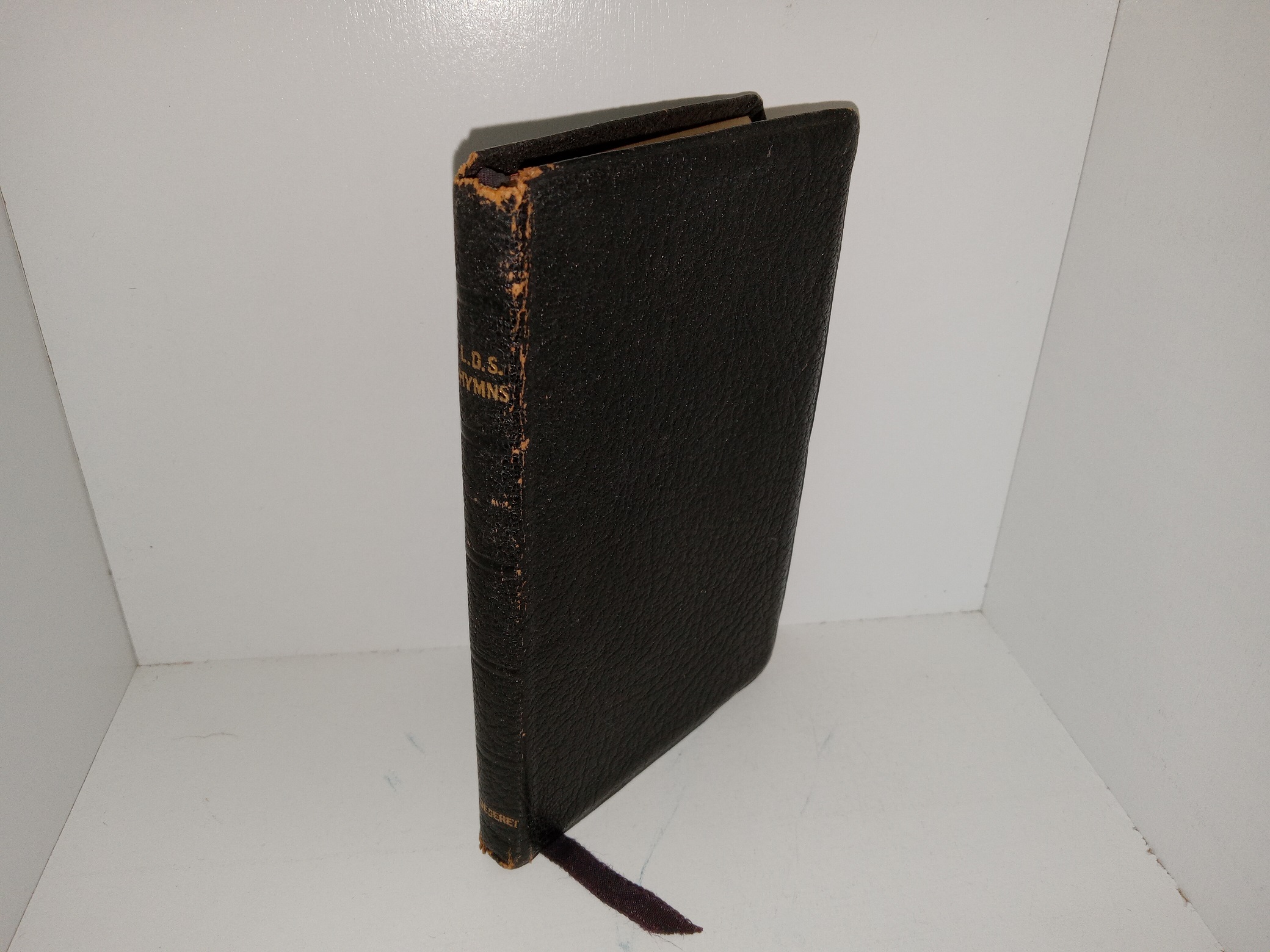 Fair condition, small, black, leather-bound book. The cover has scuffing, some tiny tears, and some tiny pieces torn off. The ribbon bookmark has minor fraying. Some pages have stains, scuffing, or some creasing. The second flyleaf has writing in pencil, and eraser marks. Text and illustrations throughout are clear and legible.