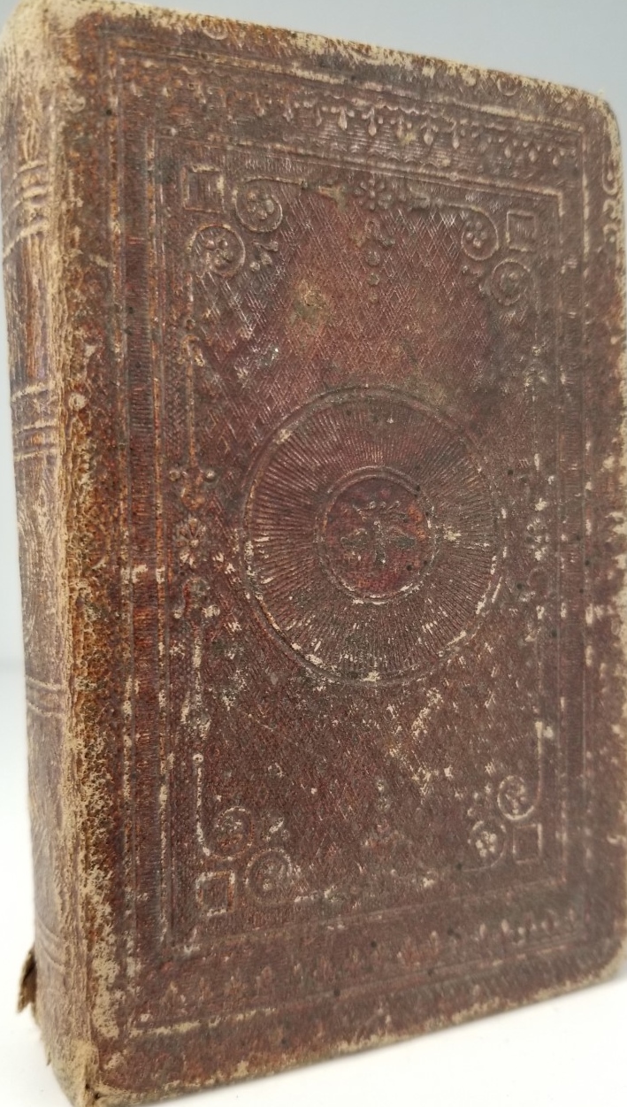 Unique binding on this little book; Right in the middle of the front board is a tiny dove with an olive branch in its beak. Brown leather; quite worn; no title page.
