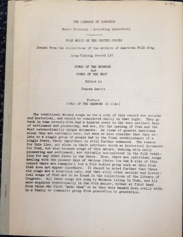 26-page Stapled Paper; the Library of Congress, Music Division, Recording Laboratory, Folk Music of the United States, Issued from the Collections of the Archive of American Folk Song Long-Playing Record 130.