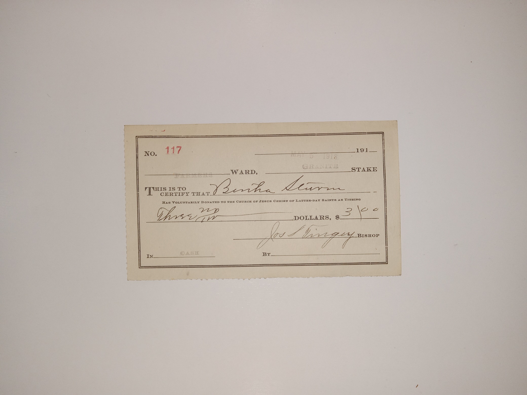 Fair-good condition, used check/note. The item has been creased once vertically, and has been filled out in pen and ink stamps. Additionally, it has some small stains and residue.