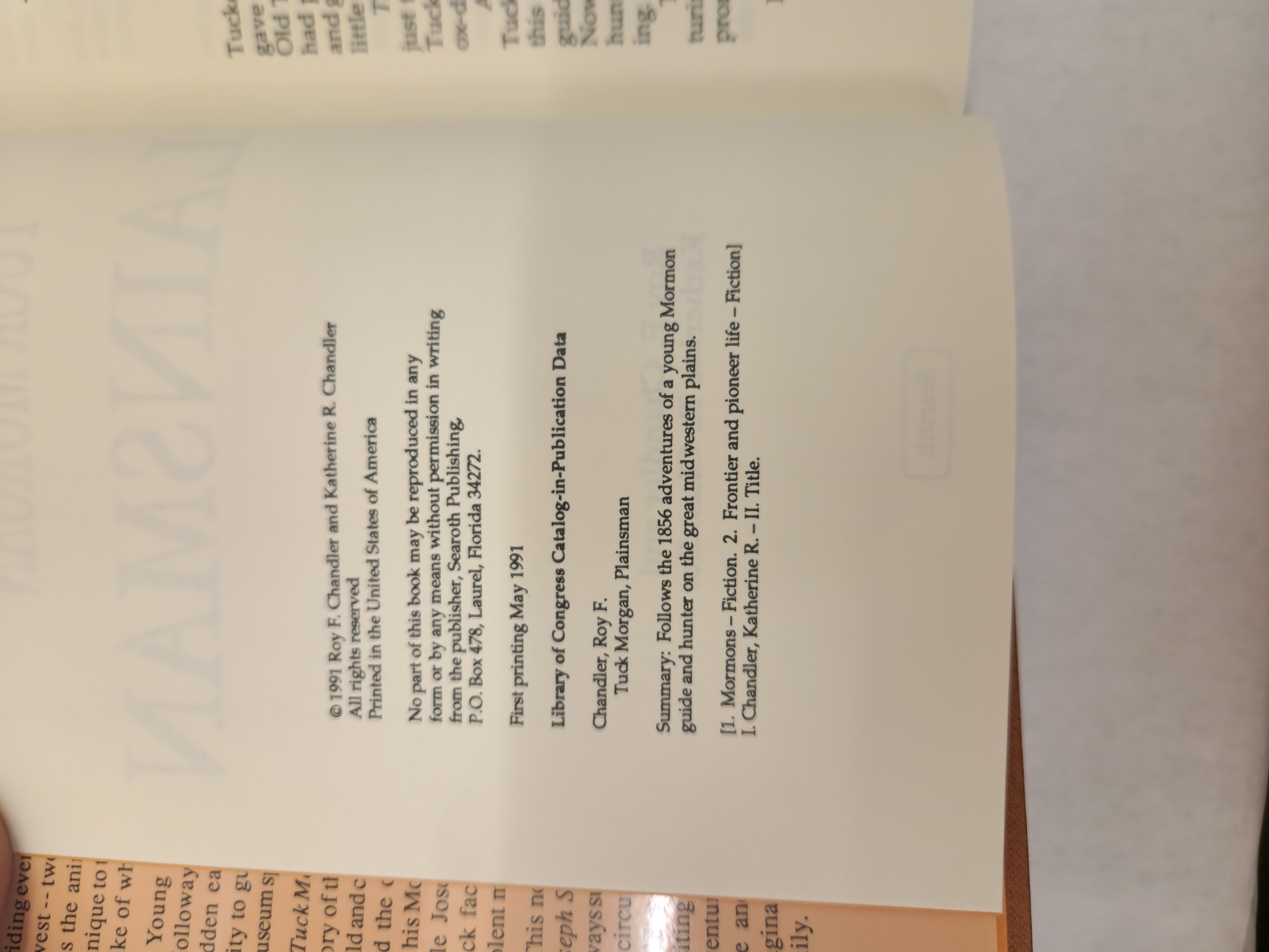 The Gun of Joseph Smith, Book Two:: Tuck Morgan, Plainsman (1991, Hardcover w/ Dust Jacket) No marks/writing on pages, except for on the first blank page (see pic in gallery). Corners and edges show minimal shelf wear. Dust jacket has some light scratch marks and several small dings. On the back of the dust jacket is a scuff mark that runs vertical across the book. Binding is good.