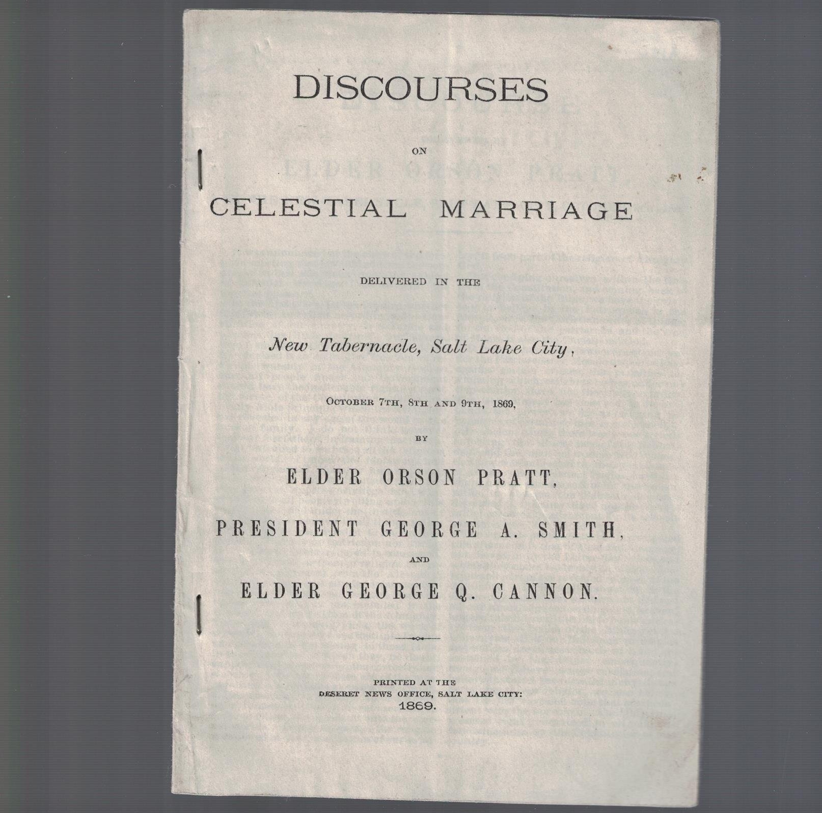1869 — Discourses on Celestial Marriage Delivered in the New Tabernacle, Salt Lake City, October 7th, 8th and 9th, 1869 by Elder Orson Pratt, President George A. Smith, and Elder George Q. Cannon