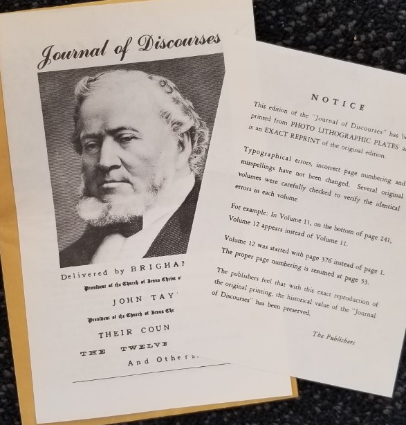 Little 4-page flyer explaining what the Journal of Discourses is, and another single sided Notice about the errors.