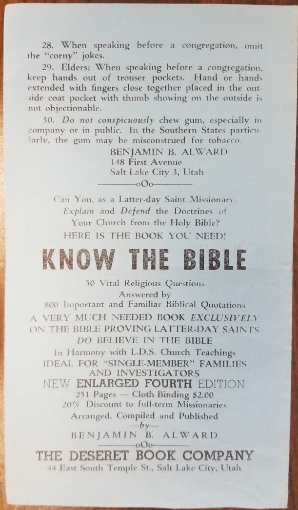 On one side it is headed: “Please Remember!” then there are 30 suggestions to missionaries on their behavior. The back cover shows a little advertisement for the author’s book, Know the Bible (by Benjamin B. Alward), by Deseret Book.