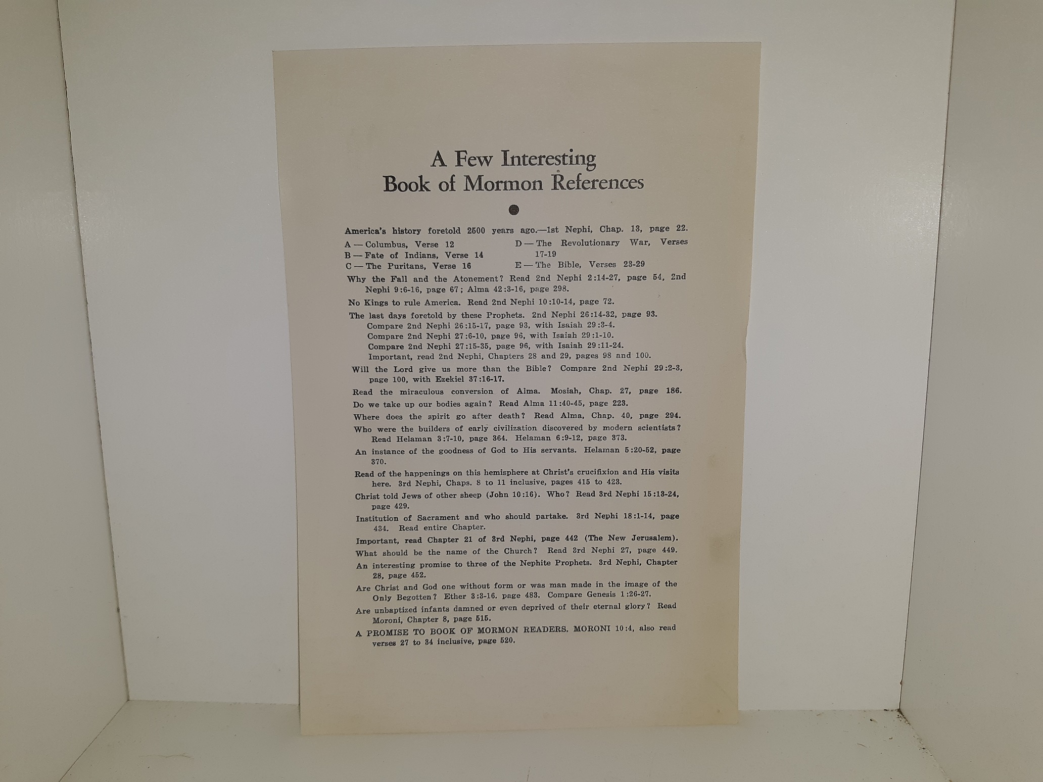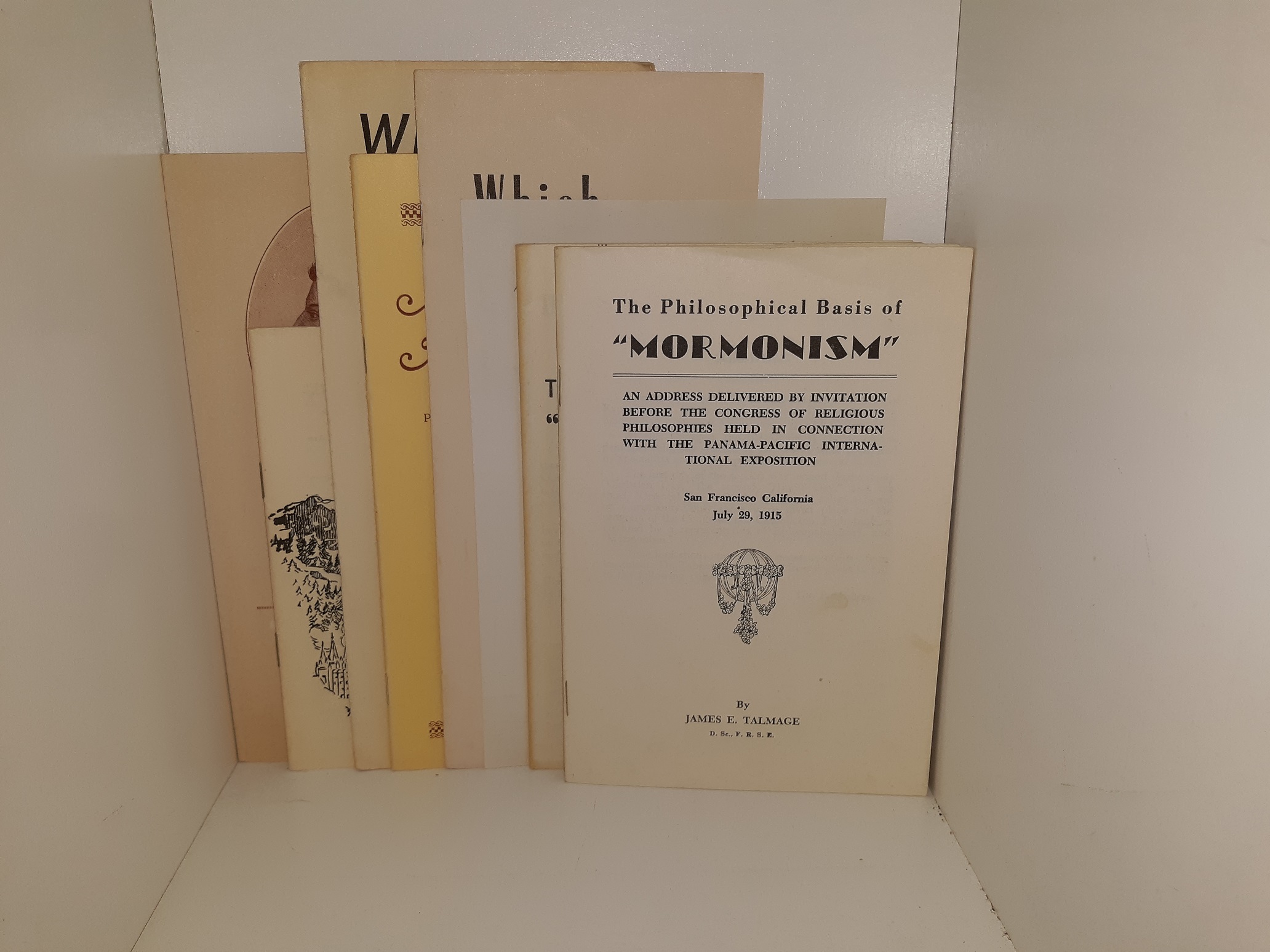 8 fair-good condition pamphlets. Some of the pamphlets have minor pencil marks, creasing, wrinkles, some small and faint stains, or minor wear at the corners and edges. The first page of The Philosophical Basis of “Mormonism” has writing in pencil and some eraser marks. Text throughout each pamphlet is clean, clear, and legible.