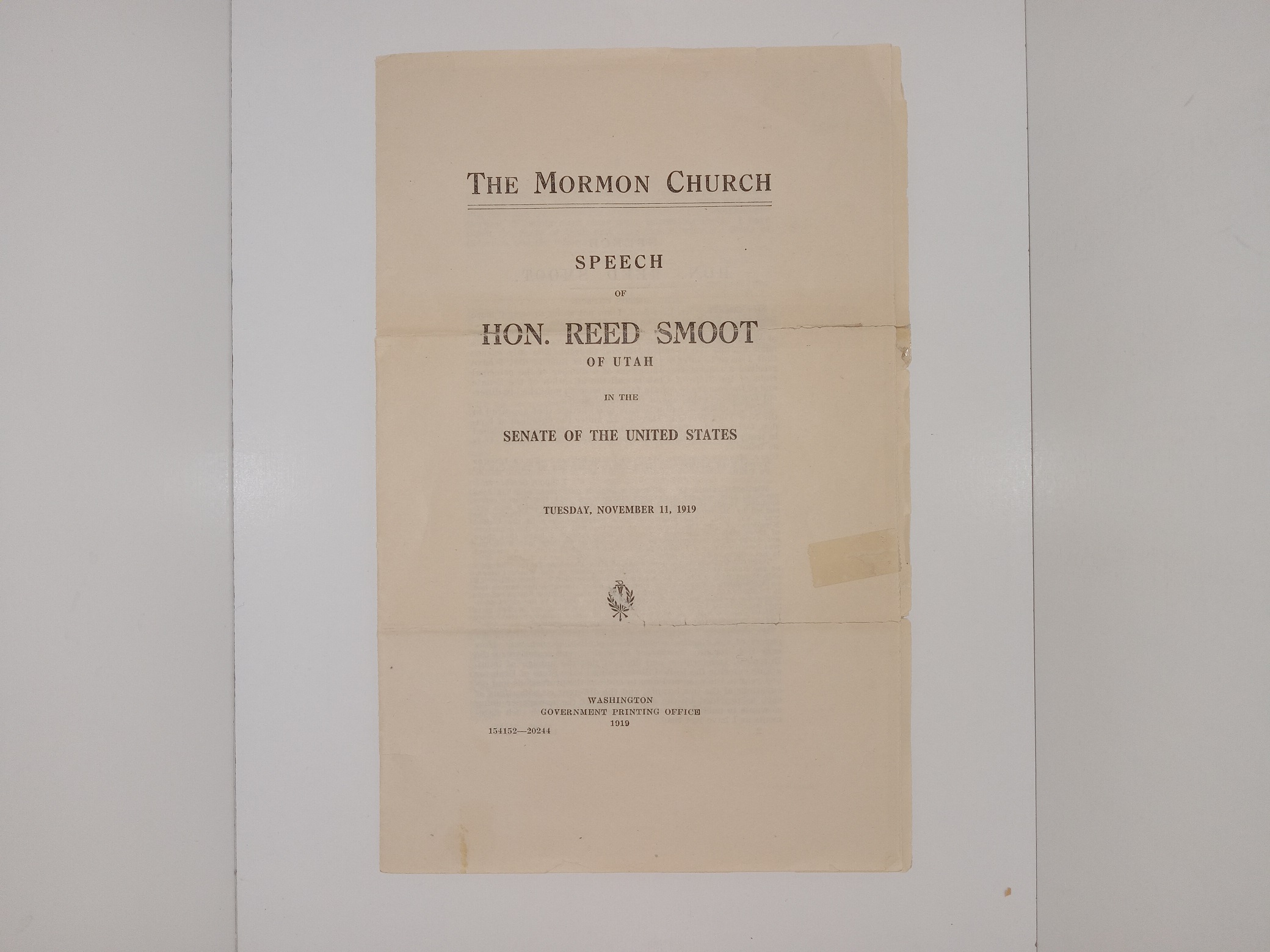 The Mormon Church: Speech of Hon. Reed Smoot of Utah in the Senate of the United States: Tuesday, November 11, 1919