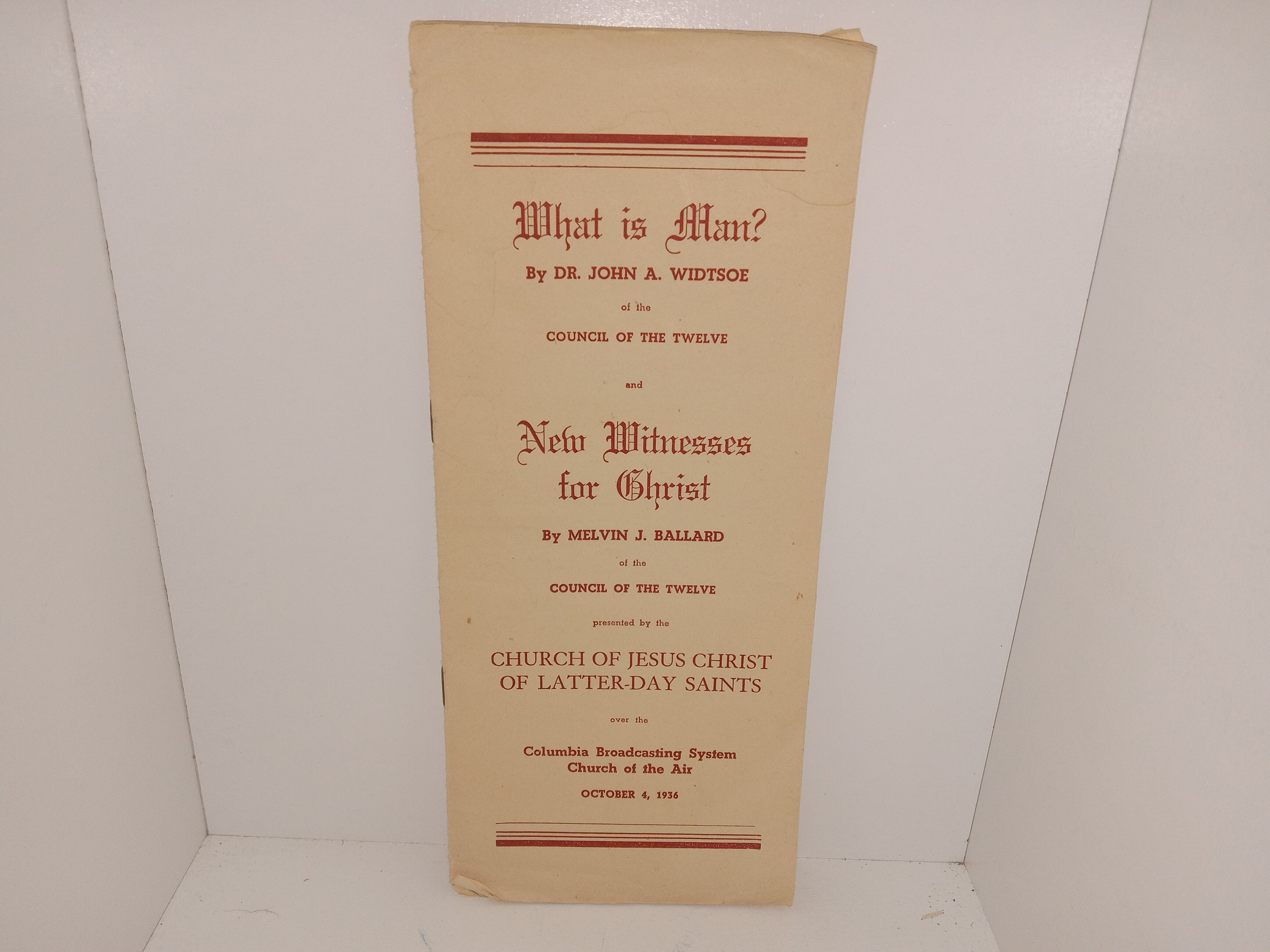 What is Man? byDr. John A. Widtsoe of the Council of the Twelve and New Witnesses for Christ by Melvin J. Ballard of the Council of the Twelve Presented by the Church of Jesus Christ of Latter-day Saints Over the Columbia Broadcasting System Church of the Air, October 4, 1936