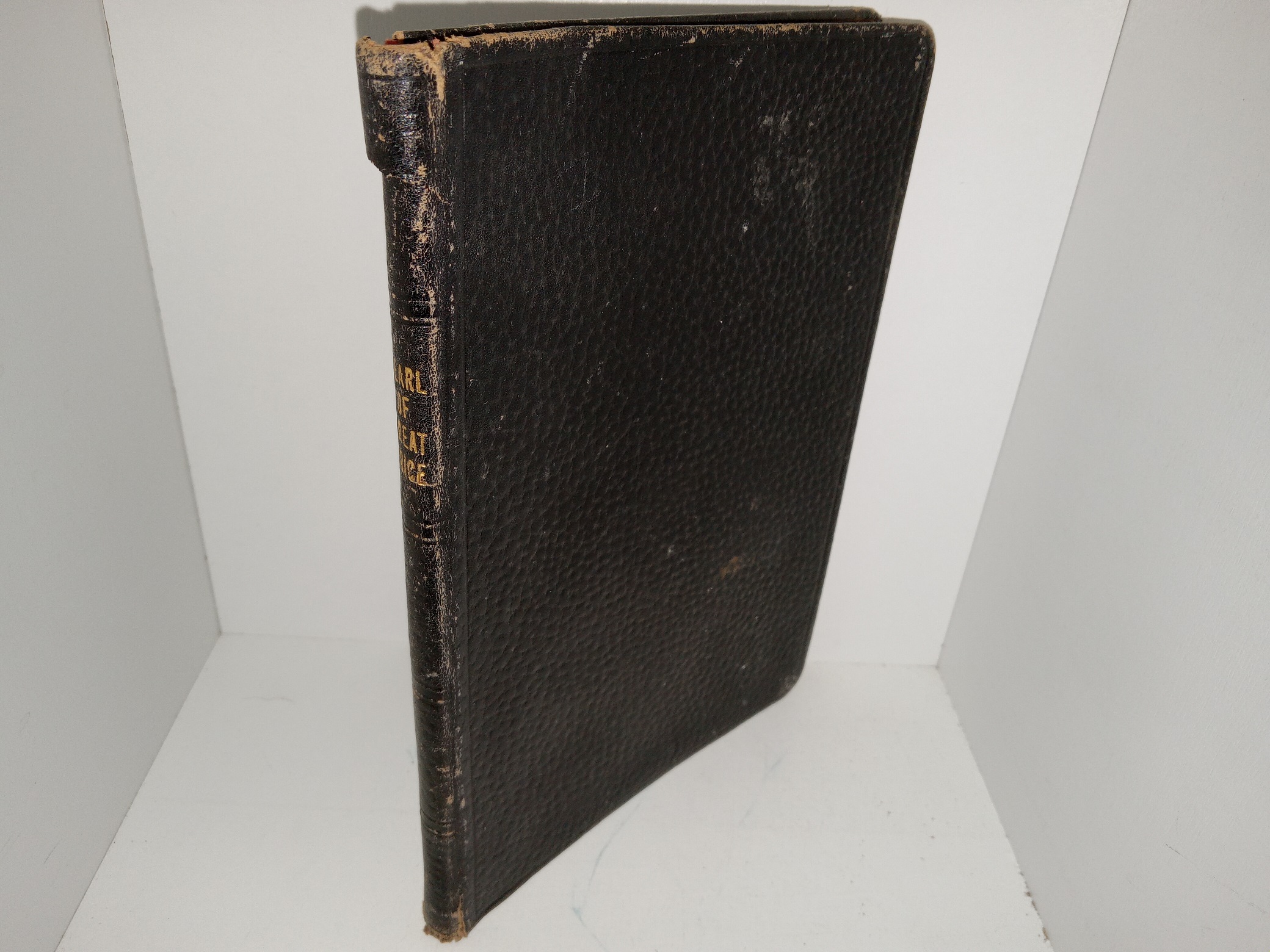 Fair condition, thin, black, leather-bound book. The cover has some tears (primarily on the spine), some small pieces torn off, scuffing, and some creasing. The internal binding is torn and loose, causing some pages to be partially detached from the binding, and leaving some residue and tearing on the front flyleaf, and the second flyleaf. Some pages have stains, creases, yellowing, or wrinkling. The front flyleaf has writing in pencil.
