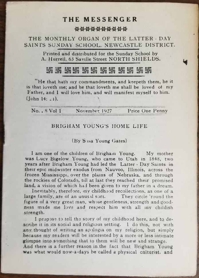 This little item was printed in England in North Shields in November of 1927. 16 pages. Smaller size; first article is by Brigham Young’s daughter, Susa Young Gates.