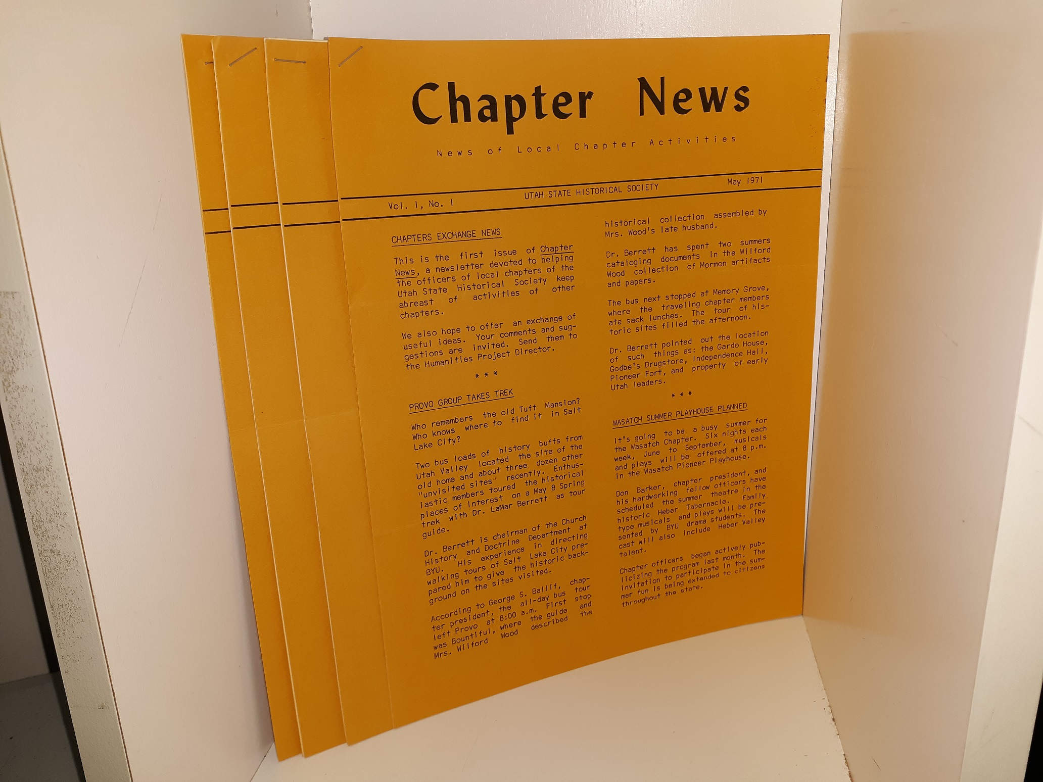4 good condition, large, thin, dark yellow softcover booklets with single staples in the top corners for binding. The booklets have creasing, and some have ink splotches on the edges. The second page of Vol. 1, No.1, May, 1971 have writing in pencil. Text throughout is clean, clear, and legible.