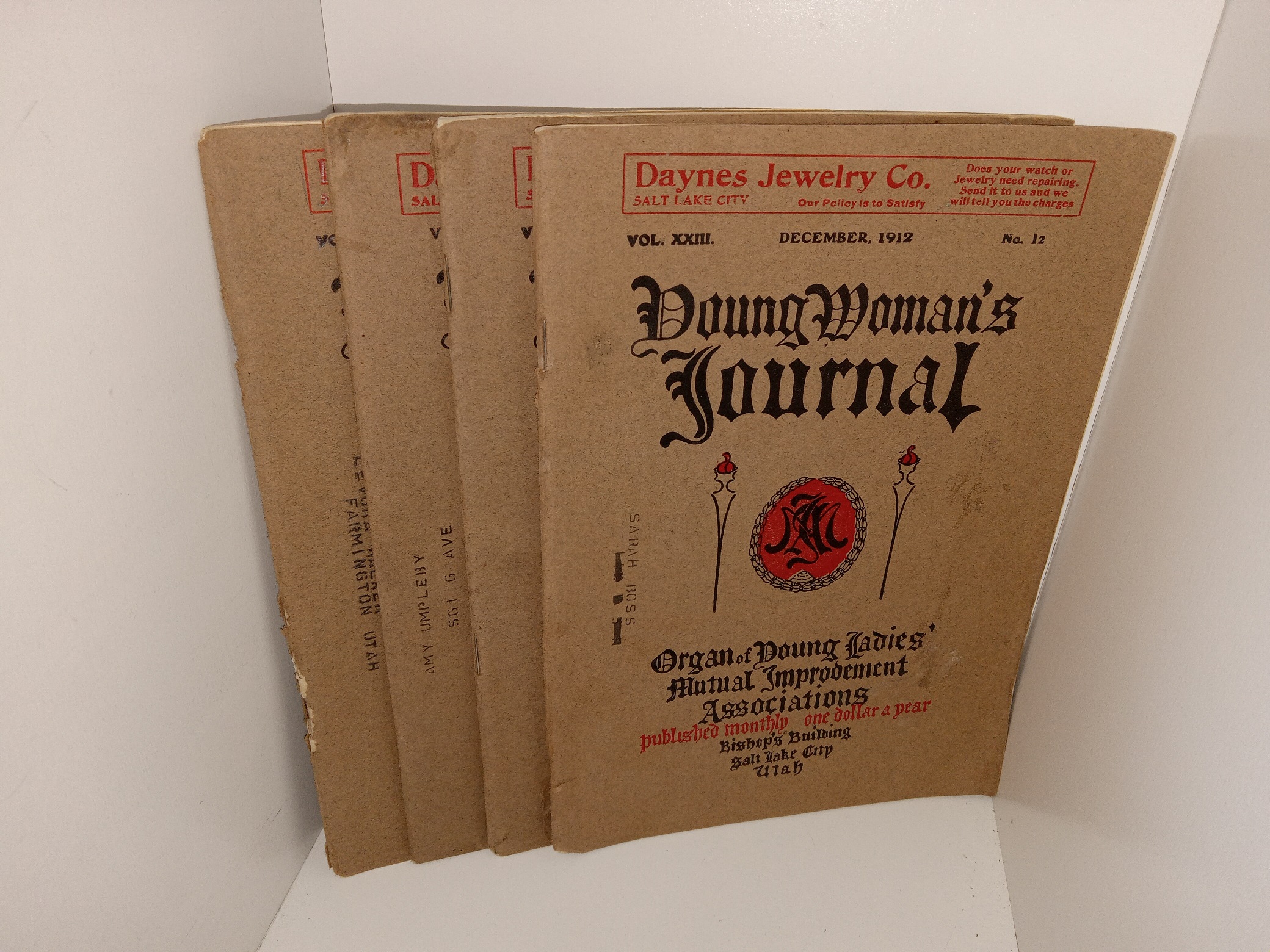 4 fair condition, thin, staple-bound, brown softcovers. The covers have tears, pieces torn off, stains, creasing, and ink stamps. Some pages may have green ink marks, stains, tears, pieces torn off, wrinkling, or creasing. The first page of No. 12 has writing in pencil. Text and illustrations throughout are legible.