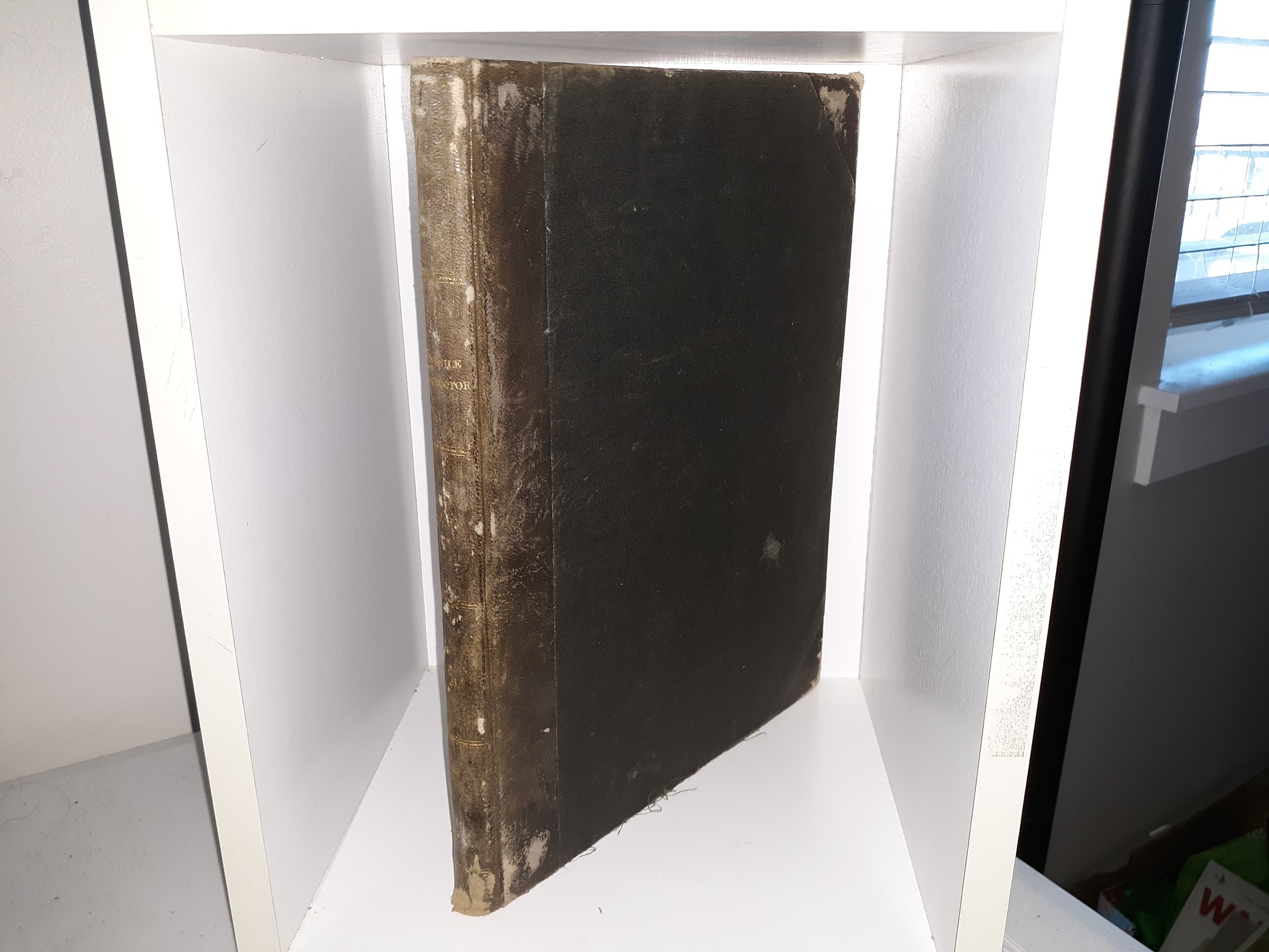 Fair condition, large, brown, 3/4 leather hardcover with no dust jacket. The cover has tears, peeling, fraying, scuffing, and scratches. The inside covers and flyleaves have stains. The internal binding is torn, and some pages are partially separated from the binding. The front flyleaf has writing in pencil, eraser marks, and adhesive residue. Text and illustrations throughout are clean, clear, and legible.