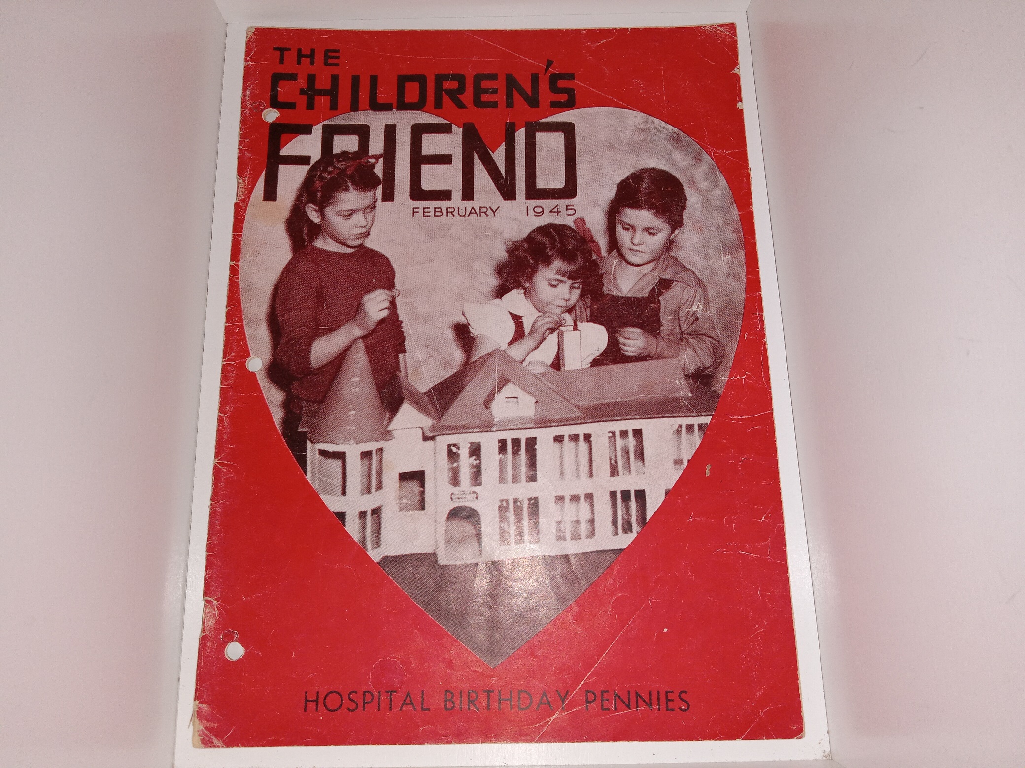 Fair condition, thin, staple-bound magazine with three holes punched next to the spine. The cover has scuffing, scratches, creases, tears, small pieces torn off, wrinkling, stains, an ink stamp, and bubbling. The activity pages in the center of the magazine have been colored in with crayon. The first page has writing in pencil.