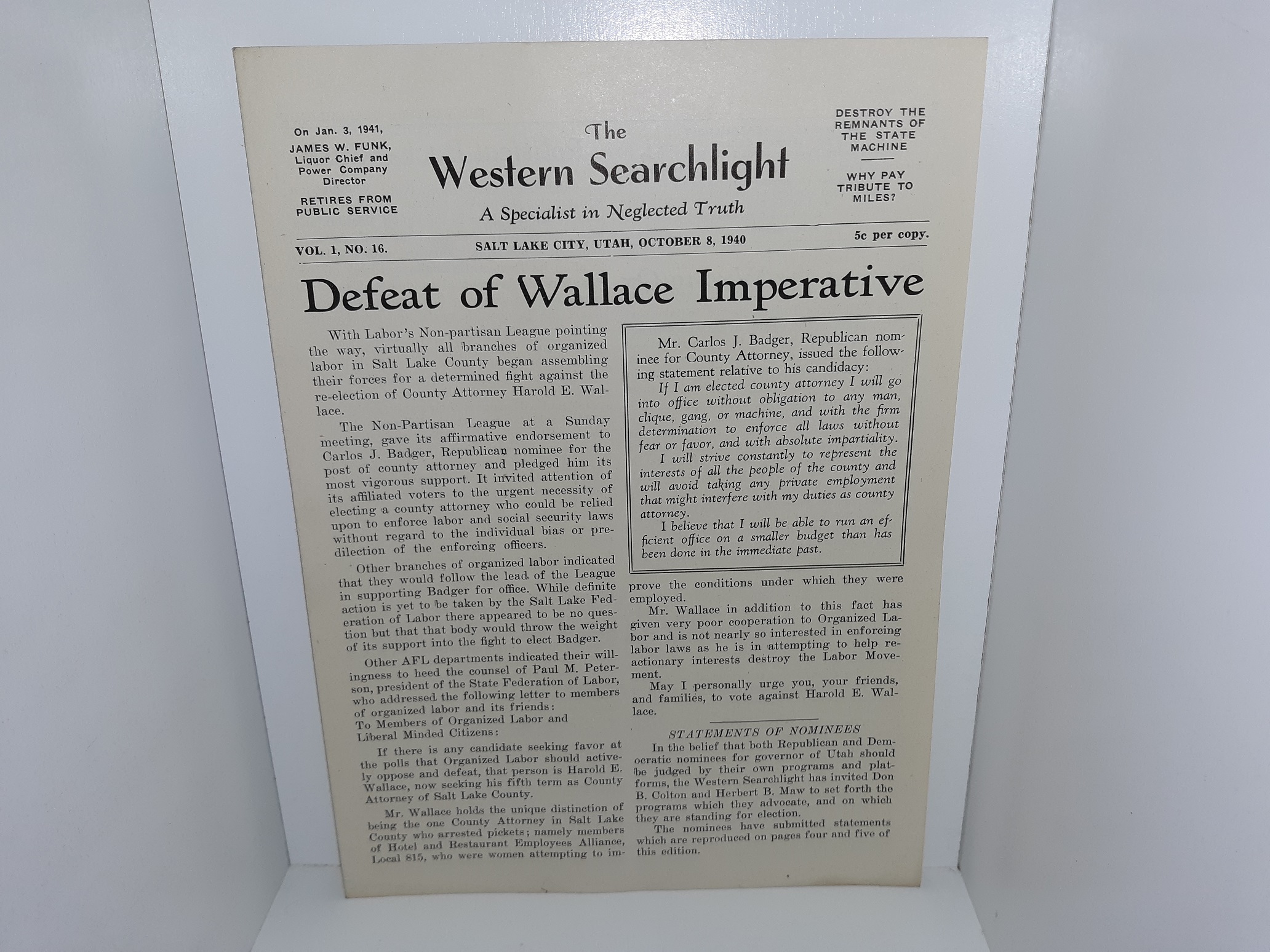 The Western Searchlight: A Specialist in Neglected Truth: Vol. 1, No. 16, Salt Lake City, Utah, October 8, 1940
