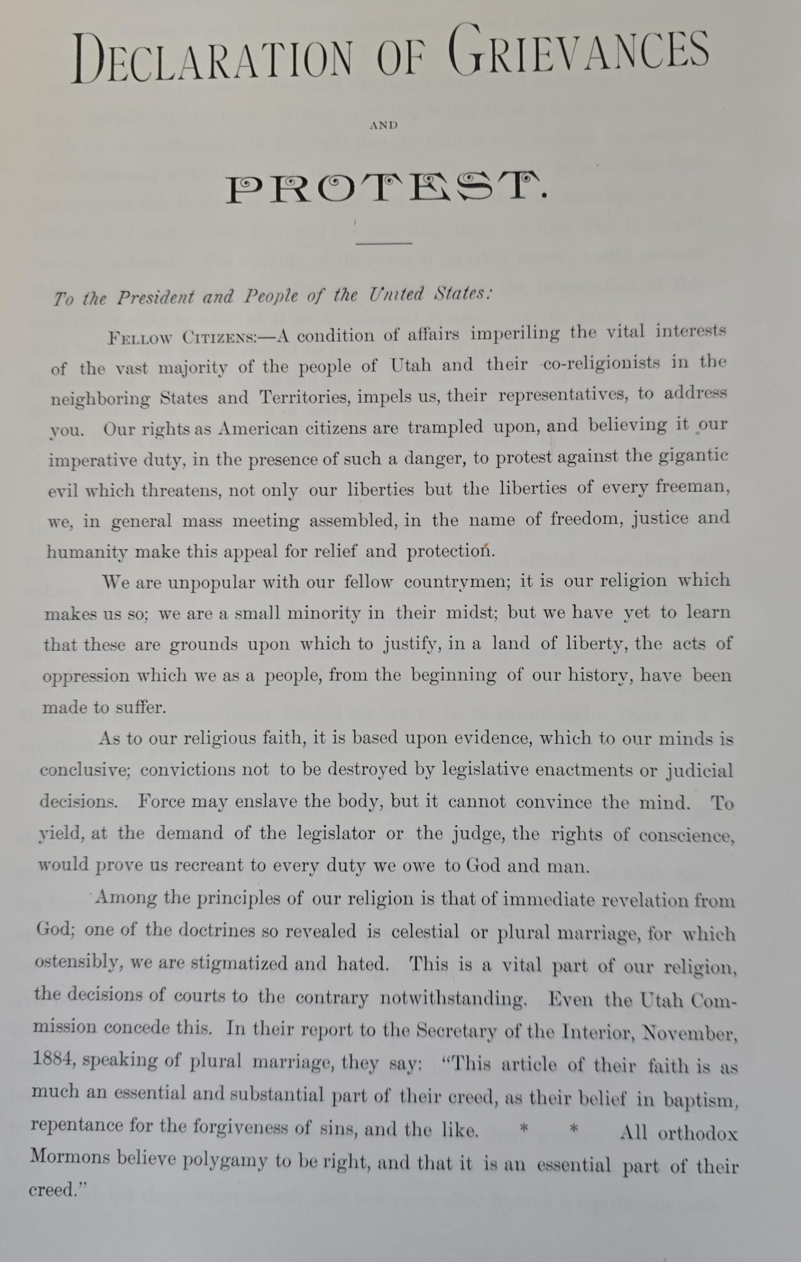 1885 — Declaration of Grievances and Protest — Ratified and adopted in mass meeting in Salt Lake City, Utah, Saturday, May 2d, 1885