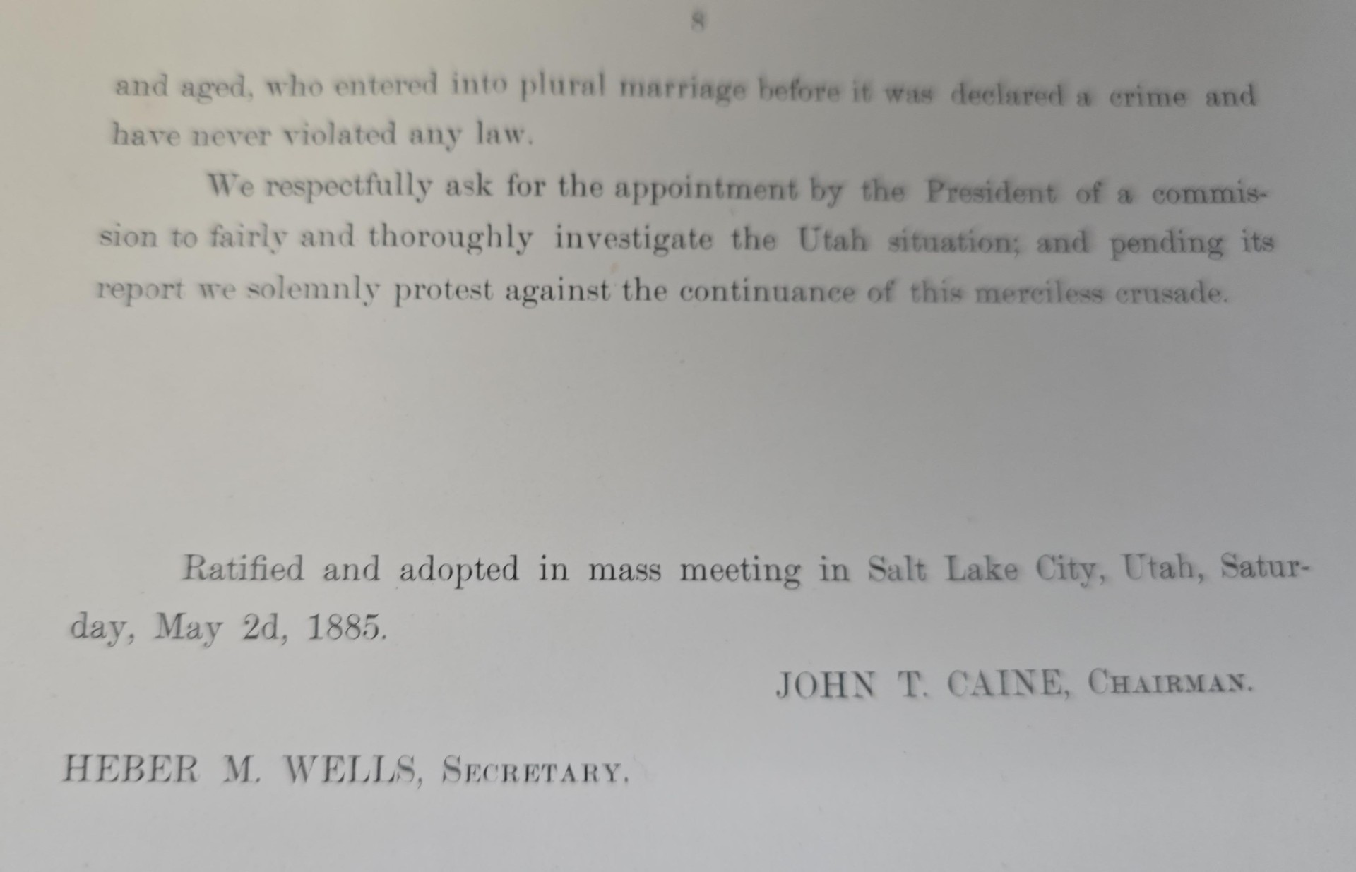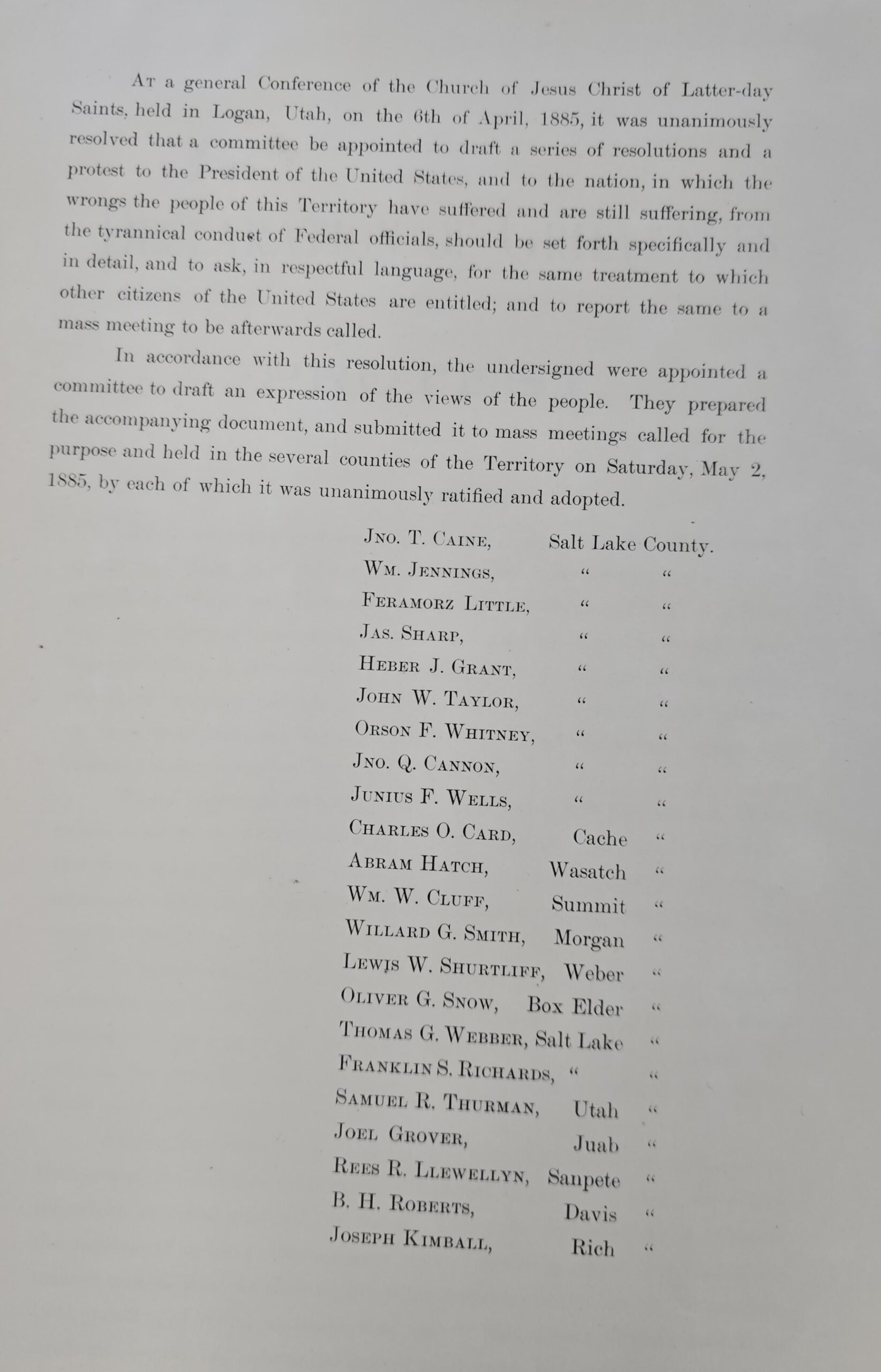 At a General Conference of the Church of Jesus Christ of Latter-Day Saints held in Logan, Utah, on the 6th of April, 1885, it was unanimously resolved that a committee be appointed to draft a series of resolutions and a protest to the President of the United States, and to the nation, in which the wrongs of the people of this Territory have suffered and are still suffering, from the tyrannical conduct of Federal officials, should be set forth specifically and in detail, and to ask, in respectful language for the same treatment to which other citizens of the United States are entitled, and to report the same to a mass meeting to be afterwards called.