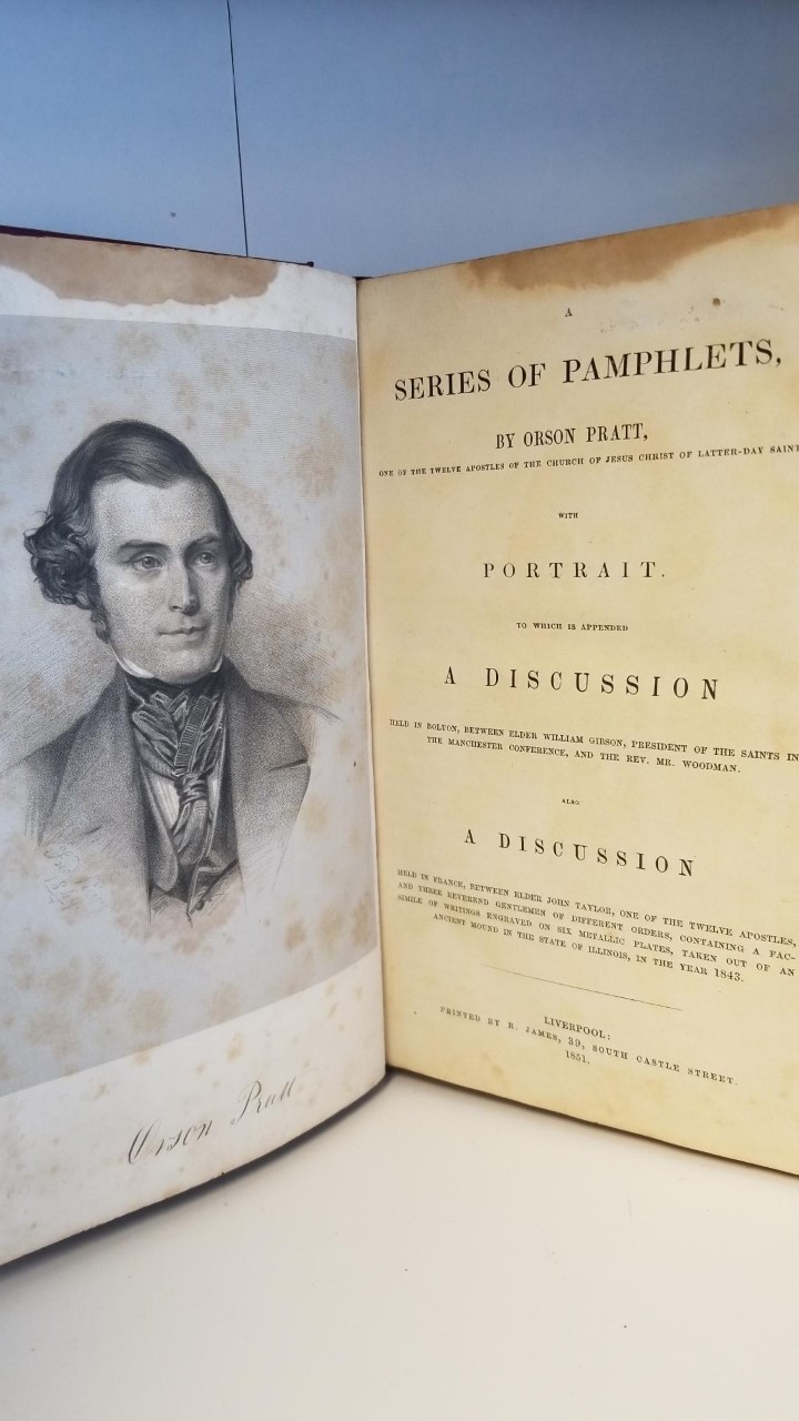 Our photographs show you the binding and the title page with frontispiece portrait of a young Orson Pratt.