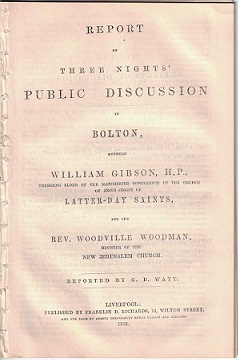 Report of Three Nights’ Public Discussion in Bolton, Between William Gibson, H. P., Presiding Elder of the Manchester Conference of the Church of Jesus Christ of Latter-Day Saints, and the Rev. Woodville Woodman, Minister of the New Jerusalem Church.