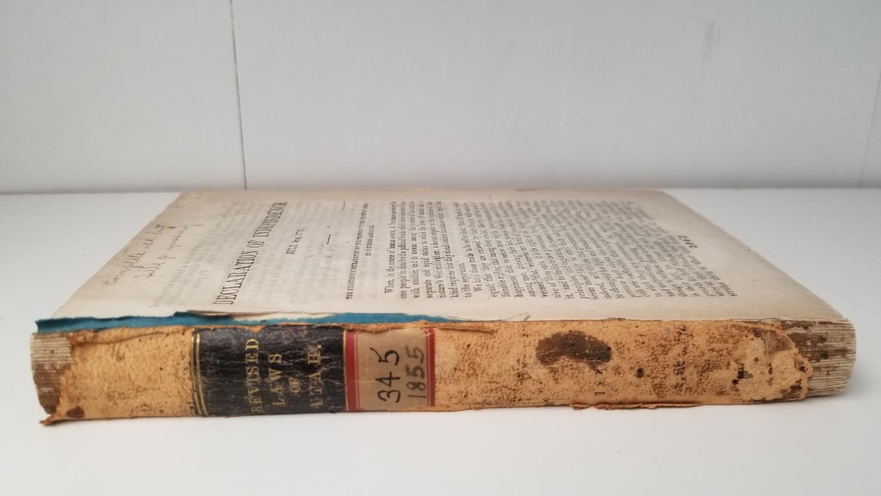 Starts with the Declaration of Independence…..no title page. 460 pages. Quite worn, but still really cool! An important early Utah item!