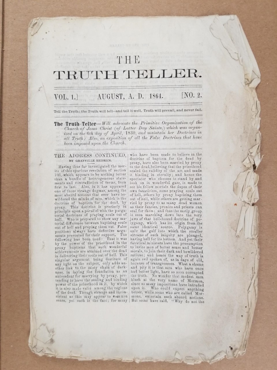 / 1864 — The Truth Teller Vol. 1., No. 2., August, A.D. 1864 — Single Issue — Granville Hedrick [The Hedrickites]