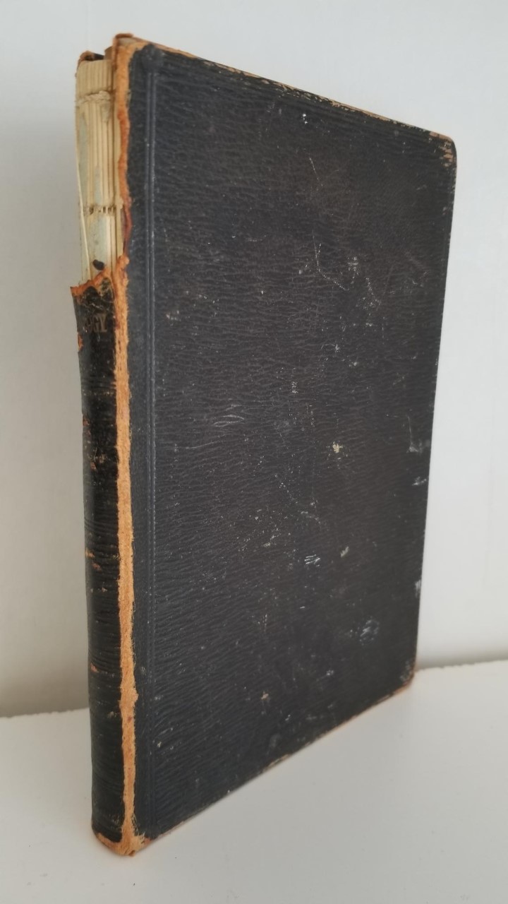 Leather binding is worn along all edges and corners; and top inch or two of spine is missing. Title page is quite good; some pages are loose and the binding is a bit loose as well.