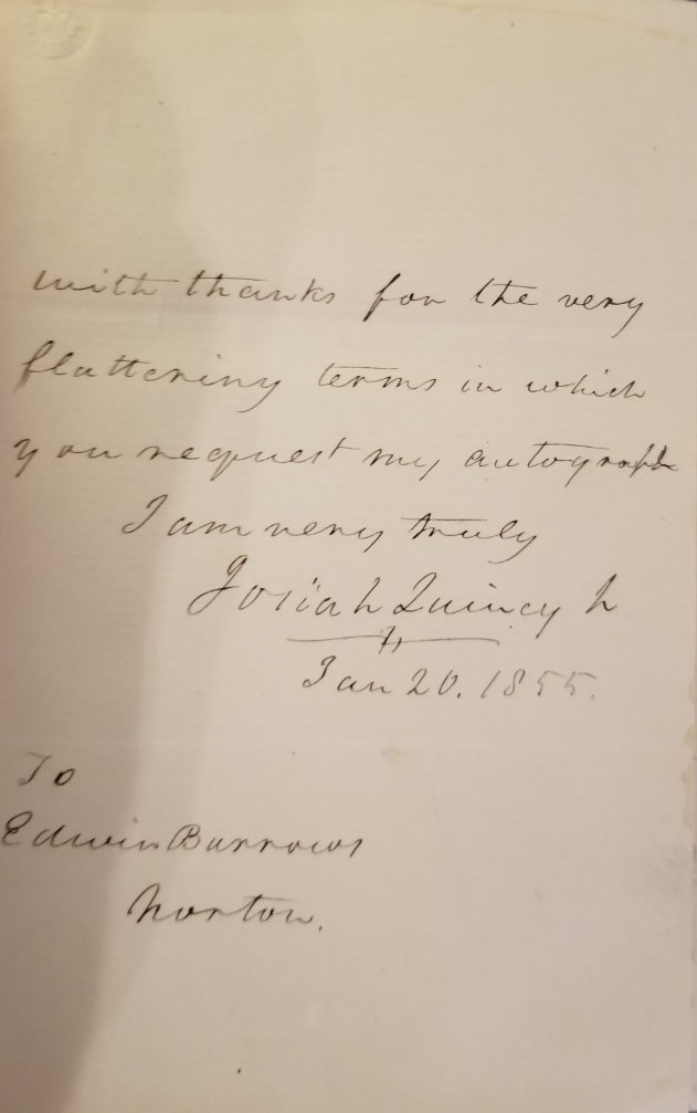 Slipped into the book is a piece of paper inscribed and signed by Josiah Quincy. The note is dated 1855, which is thirty years before the book was actually printed, and it is loose inside the front cover.