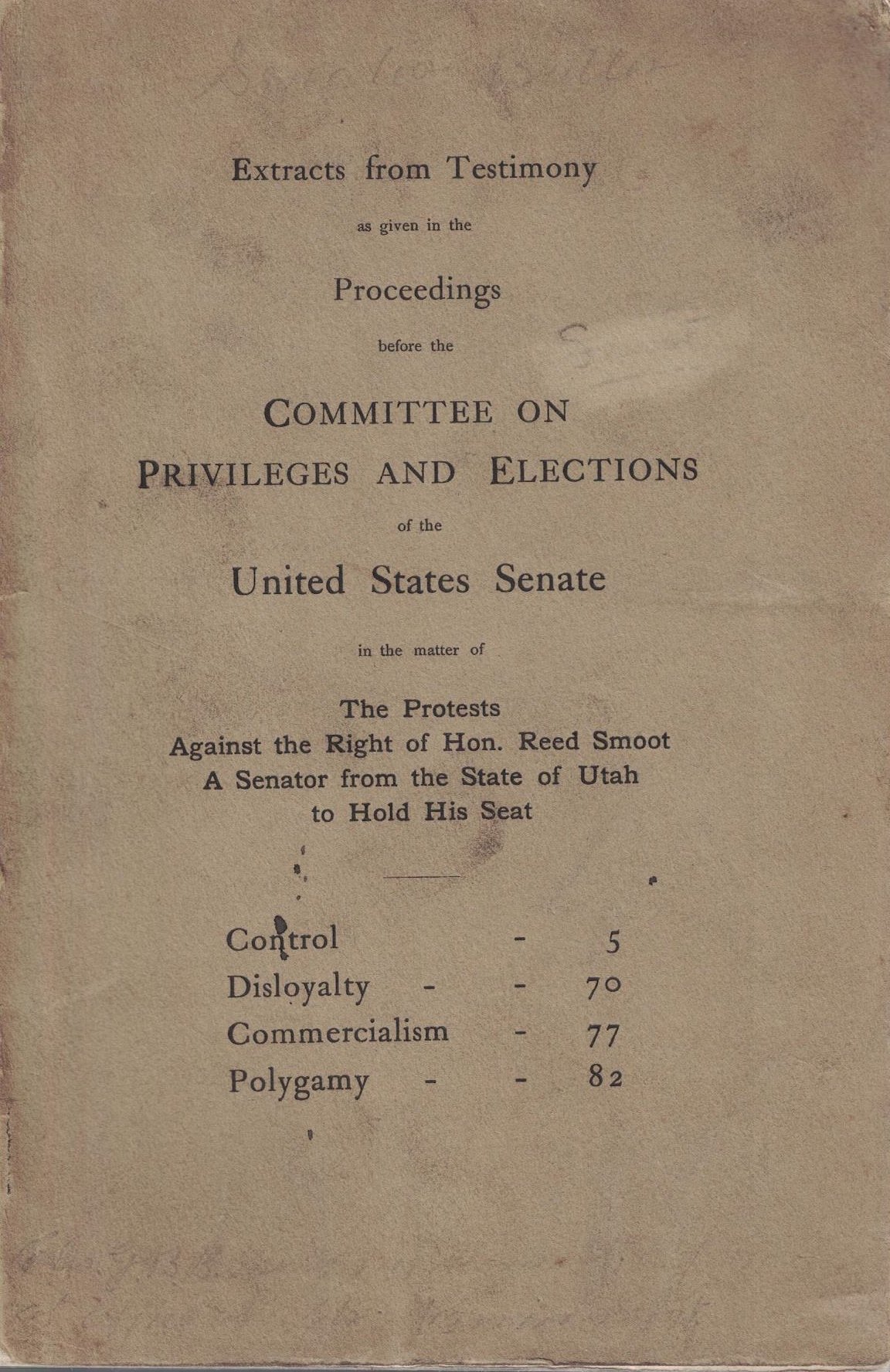 1906 — Extracts from Testimony as given to the Proceedings before the Committee on Privileges and Elections of the United States Senate in the matter of The Protests Against the Right of Hon. Reed Smoot, A Senator from the State of Utah to Hold His Seat