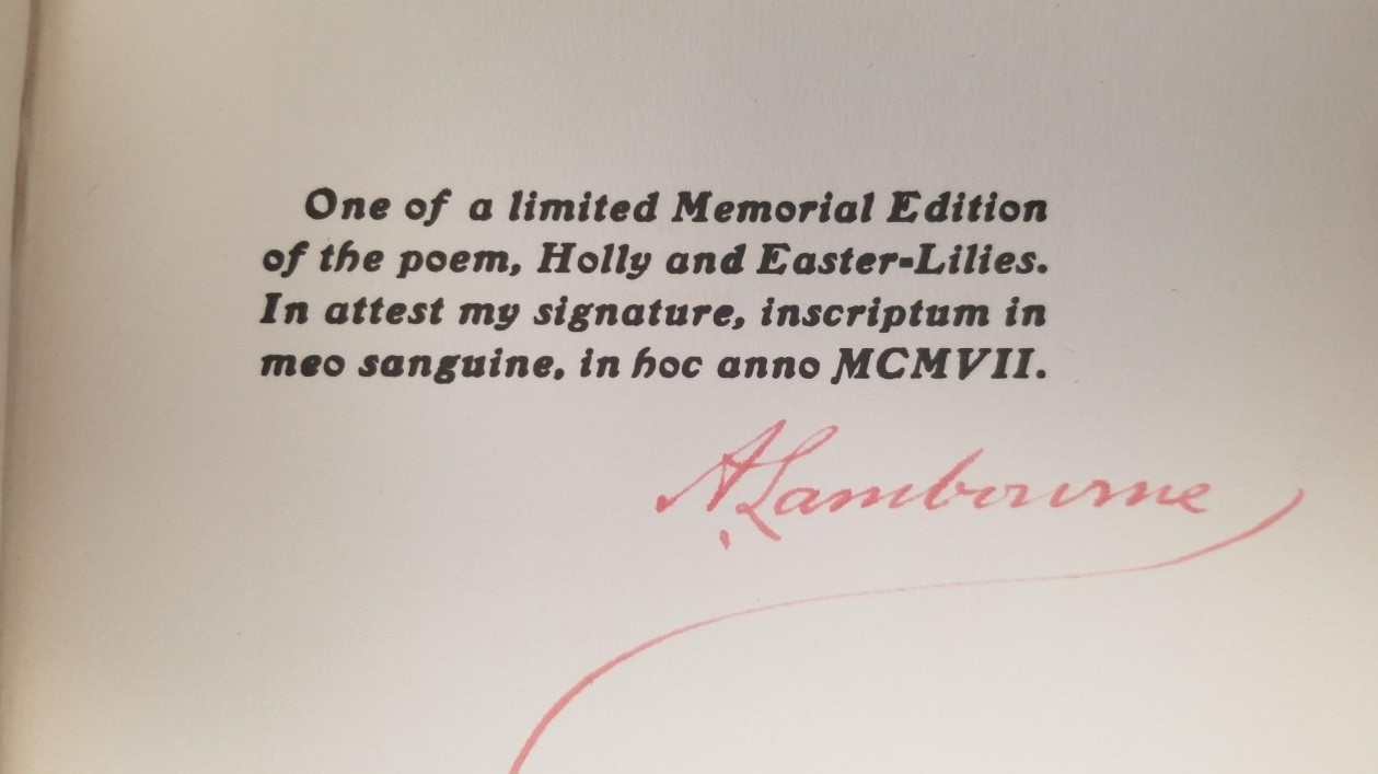 1907 — Book by Alfred Lambourne — Holly And Easter Lilies — Signed by the Author in His Own Blood! — “inscriptum in meo sanguine, in hoc anno MCMVII.”