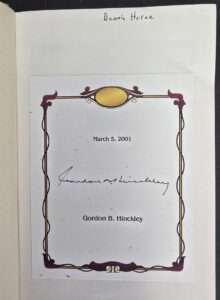 The previous owner’s name is also inked inside the book; Dennis Horne, author of several LDS Books. The book contains a sticker with the autopen signature of the author of this book, Gordon B. Hinckley.