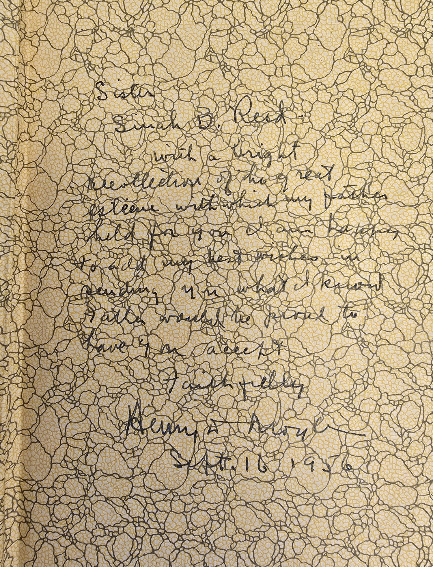 Just inside the front cover is a lengthy inscription by LDS Apostle Henry D. Moyle, and signed by him. This inscription is on decorative end sheets and is therefore a bit difficult to read.