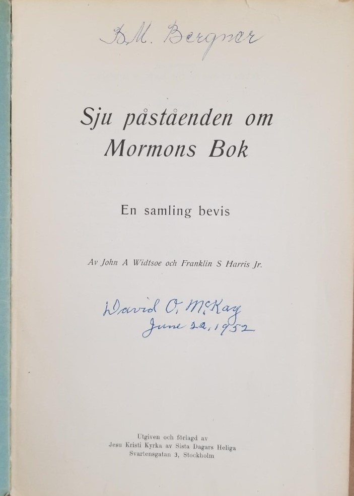/ Book Signed by President David O. McKay — Sju pastaenden om Mormons Bok – En samling bevis — John A. Widtsoe & Franklin S. Harris