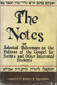 The Notes; Or Selected References on the Fulness of the Gospel for Saints and Other Interested Students. Volume One. Published by the Bitterroot Publishing Company; Pinesdale, Montana, 1980. First Printing. Compiled and Written by Robert R. Openshaw. 616 pages. Brown cloth hardbound; thick book! Wonderful Fundamentalist Item which deals with subjects such as Adam-Ondi-Ahman, Michael the Archangel, The First Man, Blood Atonement, Jesus Christ–son of Adam, Adam-God doctrine, Changed Positions, Apostasy in the Last Dispensation, Rebaptism in Nauvoo, Rebaptism of Ogden Kraut, What is an Oracle?, Ten Lost Tribes and Enoch, Abortion, homosexuality, plural marriage, manifesto, polygamy, and much much more; this book is packed with information; very scarce; only one volume done; no volume two was ever made. Clean text, except one page with blue ink markings in margins; good condition overall; with fair dust jacket, jacket has bit of ink marking on back side.
