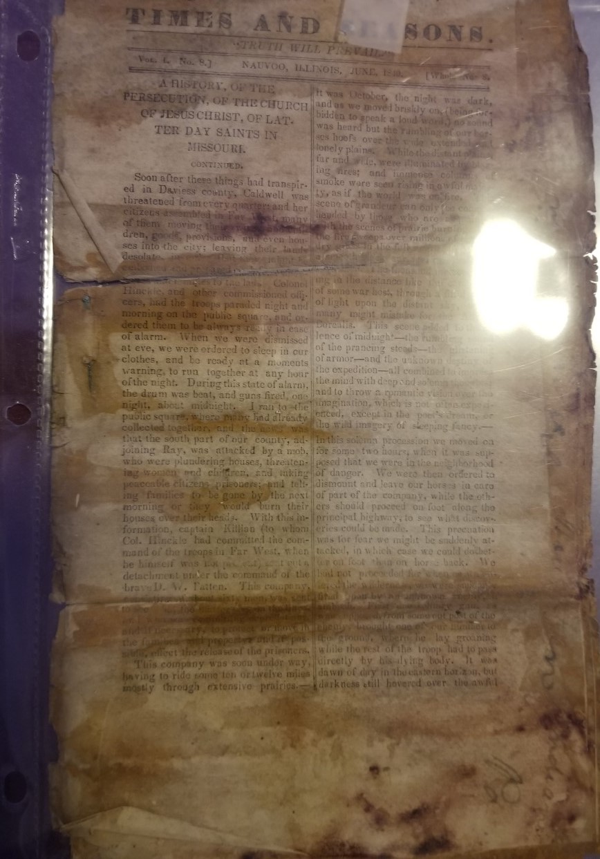 Times and Seasons, single issue; very fragile and brittle. In a plastic container. Very worn and faded with chipping to edges. May be split in two or in three pieces as indicated from the photograph. We don’t dare remove the issue from the plastic slip case its so brittle.