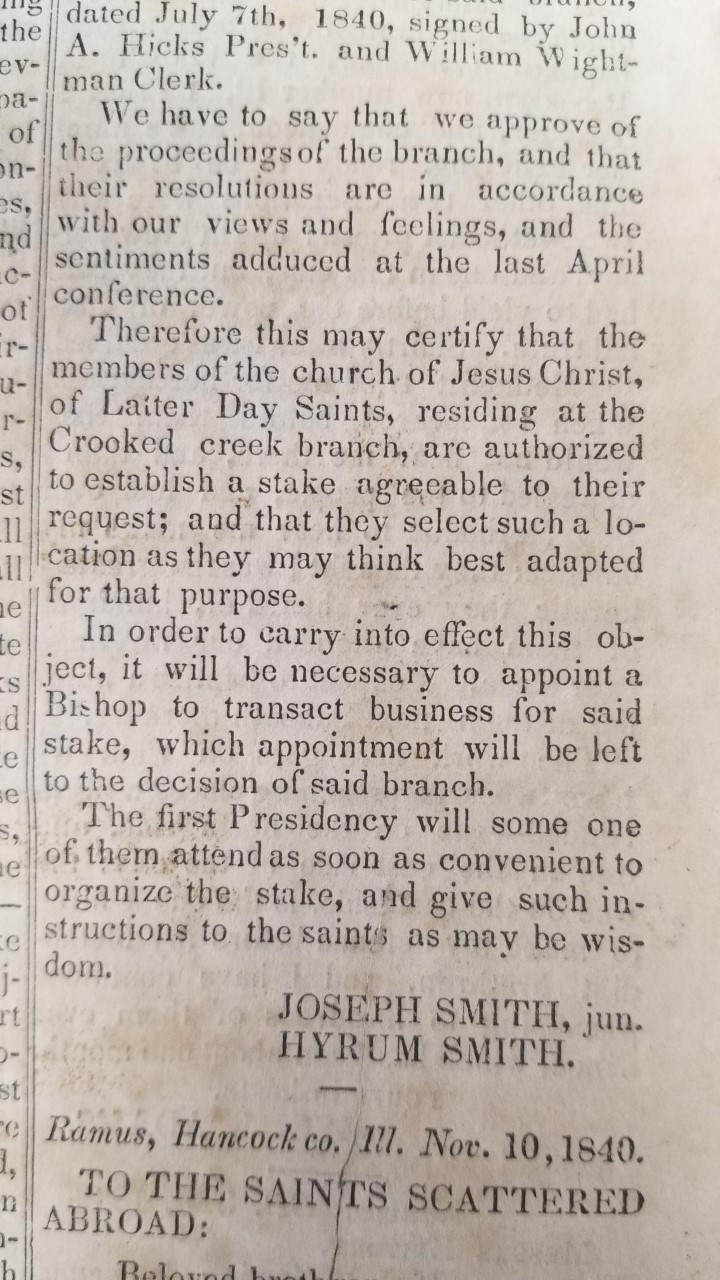 RAMUS, Nauvoo, July 14th, 1840, To the Saints of the Crooked Creek Branch… by Joseph Smith, jun. and Hyrum Smith.