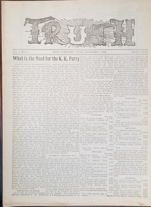 16-Page Newspaper; as pictured; great condition. Main article on page one is “What is the Need for the K.K. Party.” It compares Mormons and “Gentiles” and their pay and their offices.