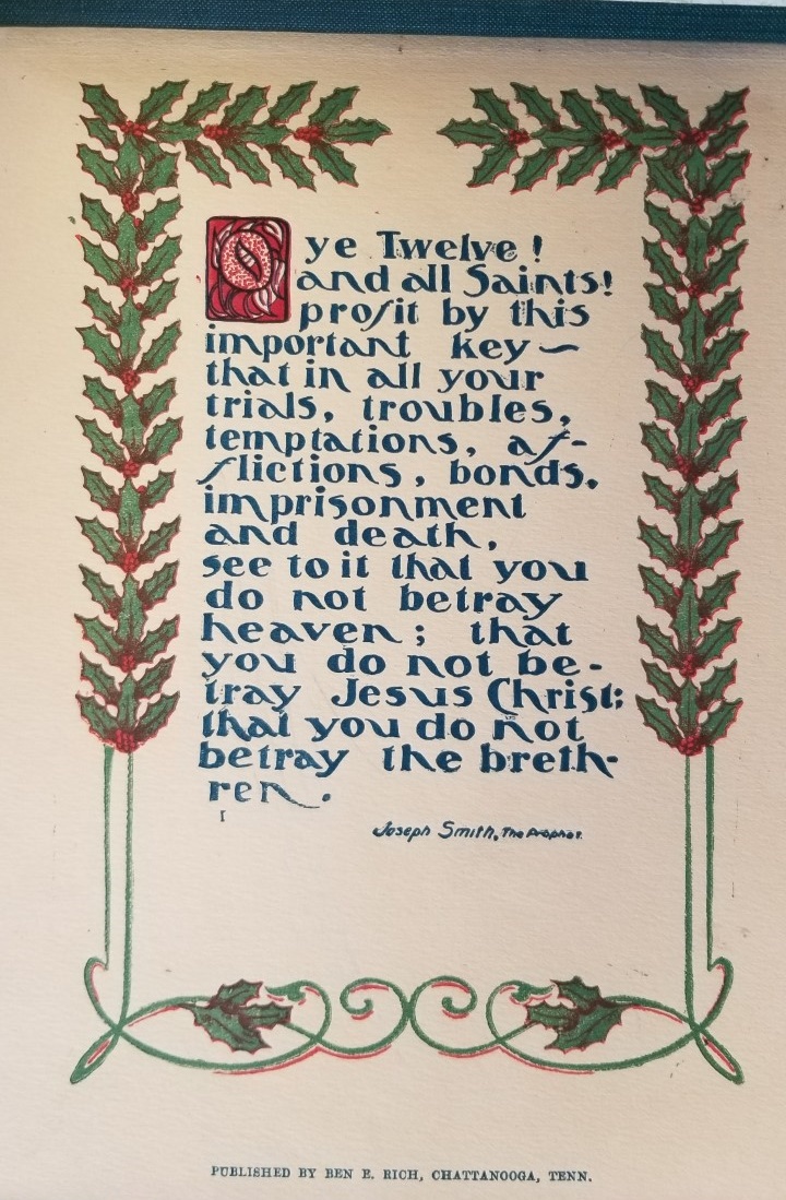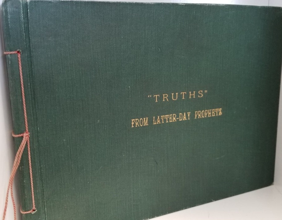 This is the only copy of this book we have ever seen. Green cloth oblong shaped with string spine. The pages inside are nicely illustrated and colored and are quotes from Prophets. Each page is like card stock and each quote could be removed and framed nicely.
