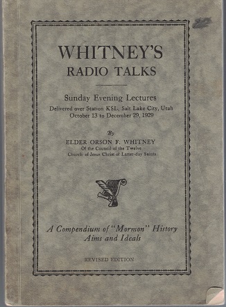 Whitney, Orson F. Whitney’s Radio Talks – Sunday Evening Lectures Delivered over Station KSL, Salt Lake City, Utah, October 13 to December 29, 1929. A Compendium of “Mormon” History Aims and Ideals. Revised Edition. 115 pages. Text is clean throughout; binding is good; some wear as expected. Rare booklet.
