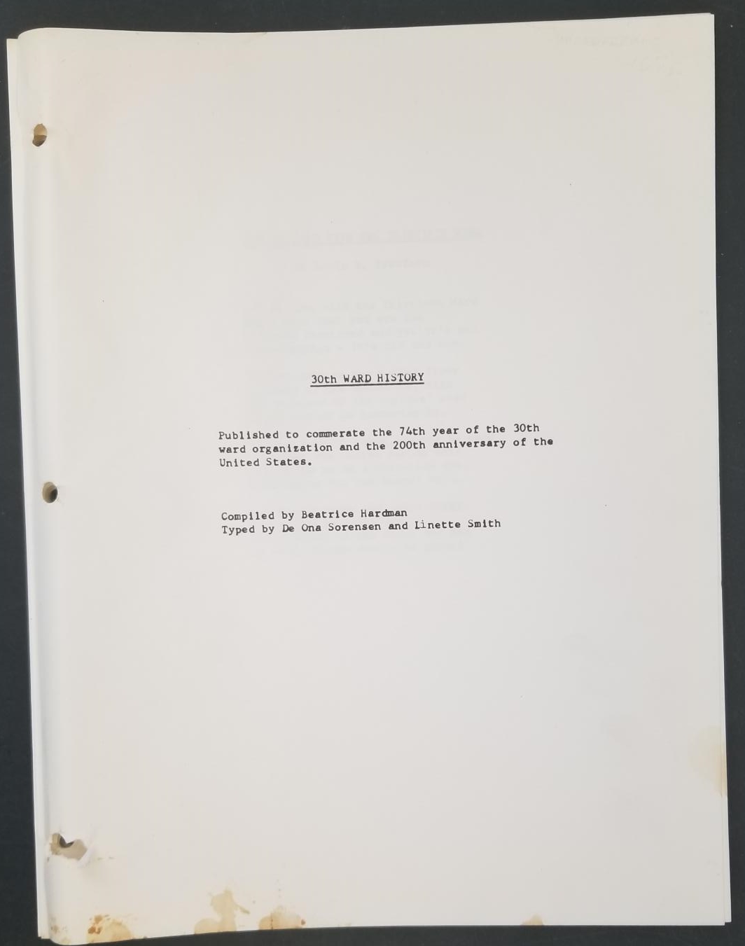 30TH Ward History – Published to Commemorate the 74th Year of the 30th Ward Organization and the 200th of the United States — Compiled by Beatrice Hardman