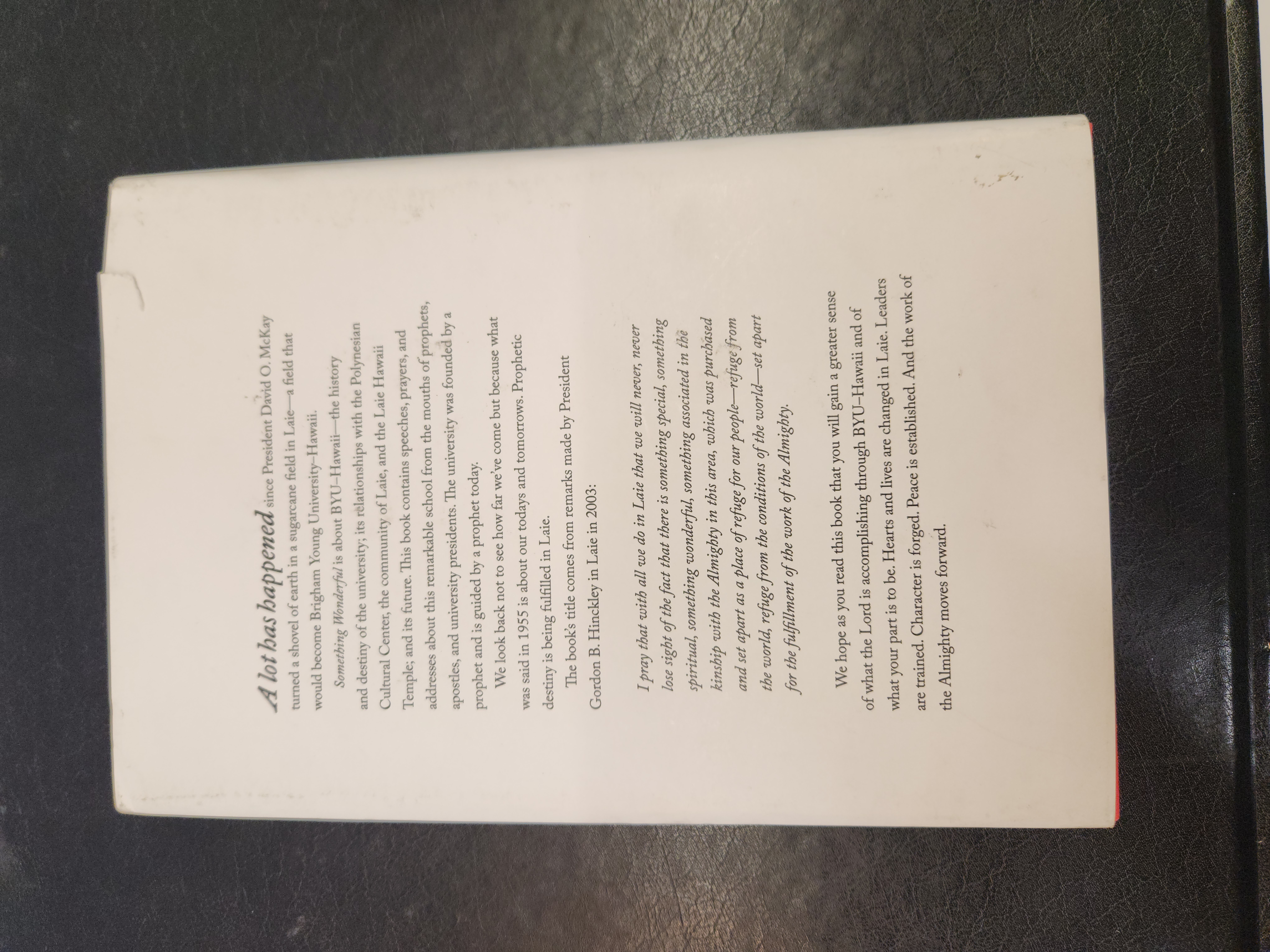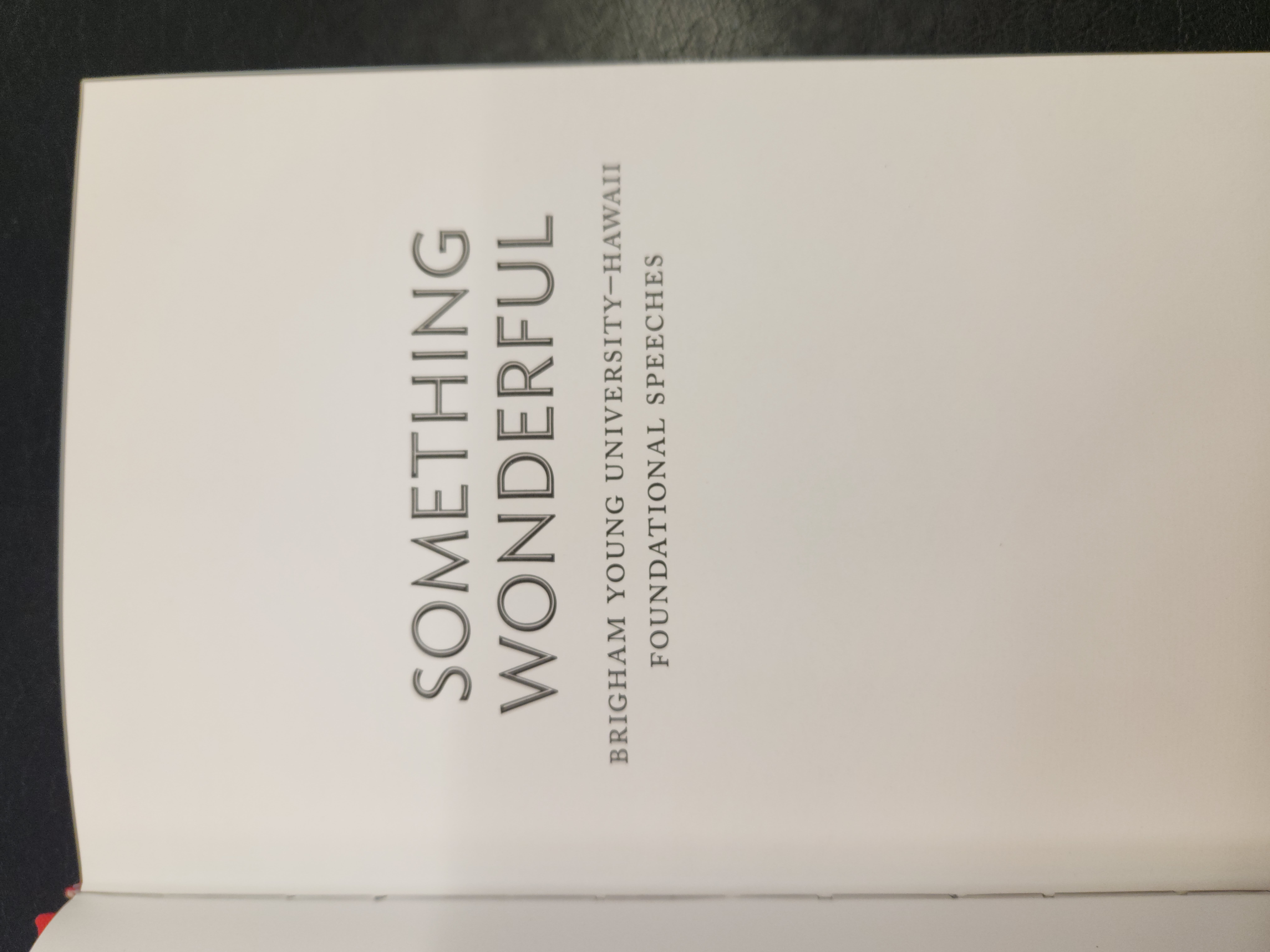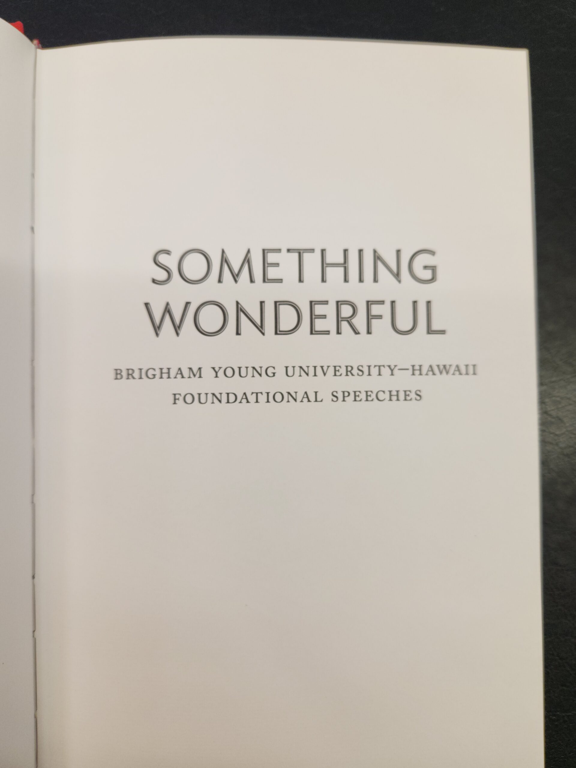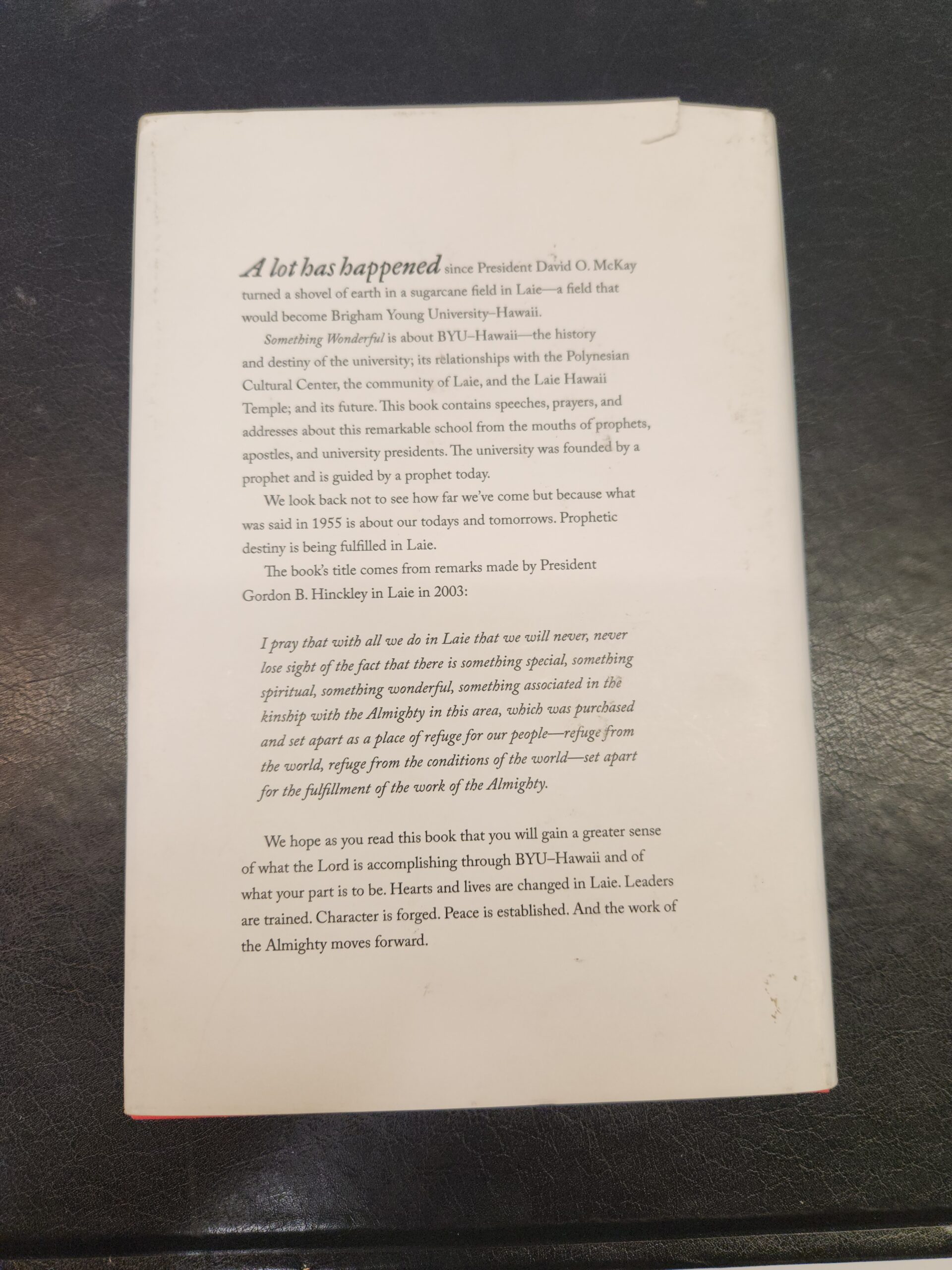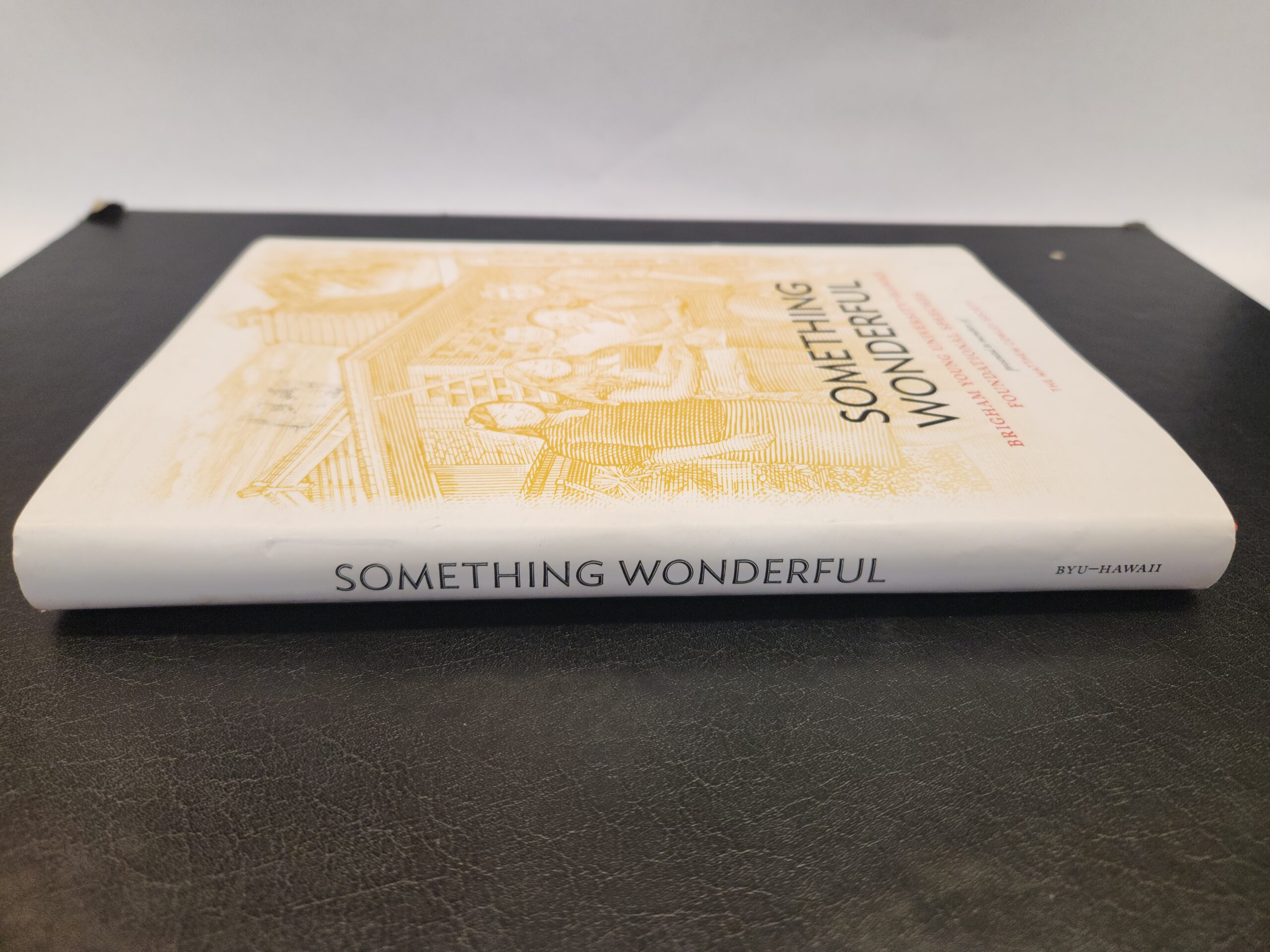 Something Wonderful:: Brigham Young University – Hawaii Foundational Speeches (2012, Hardcover w/ Dust Cover) No marks/writing on pages. Corner and edges show minimal shelf wear. Binding is good. Front cover, on dust jacket, has some smudge/scuff marks and sticker residue. Back cover, on dust jacket, has a small tear at the top and some scuff/smudge marks.