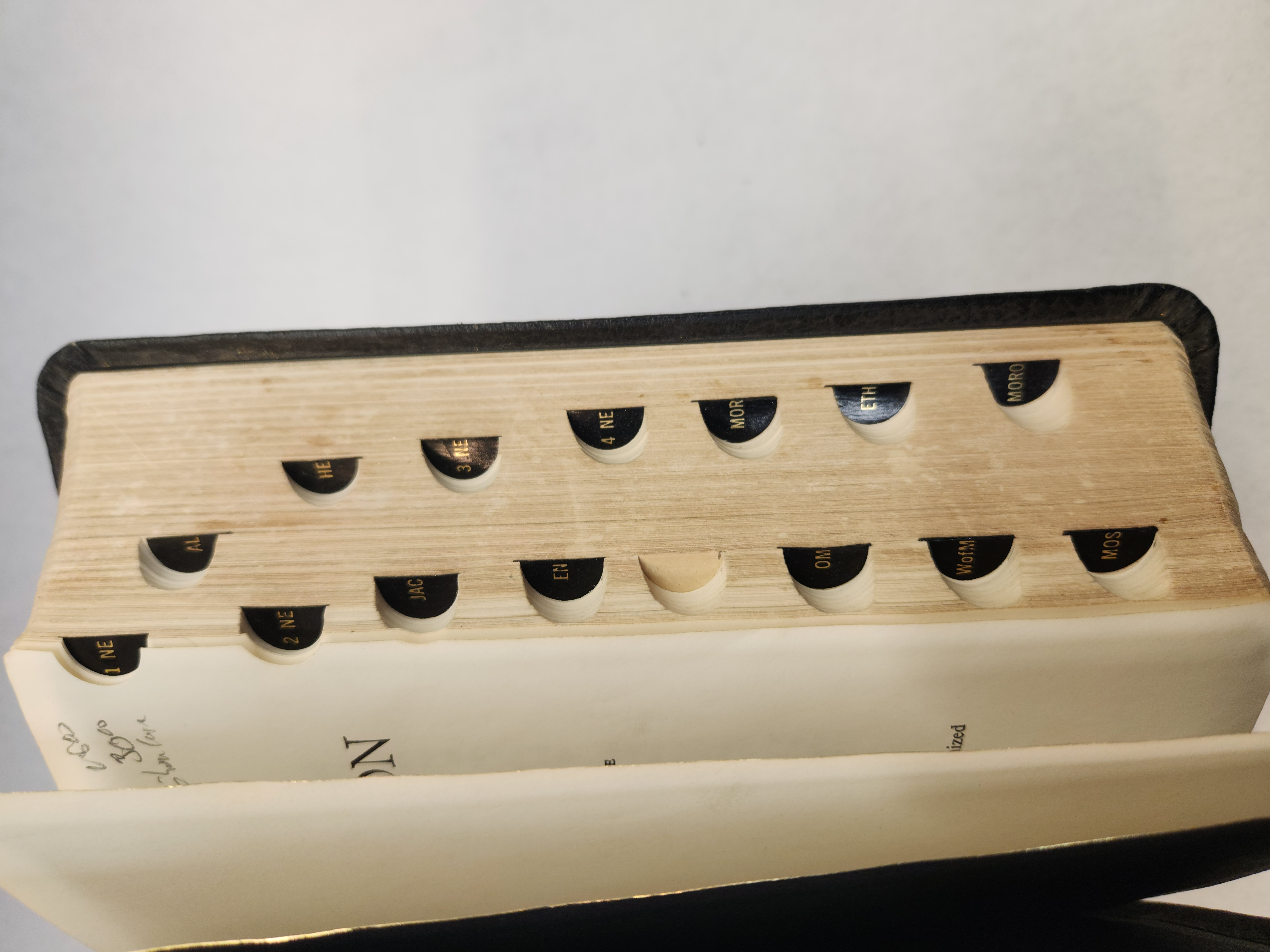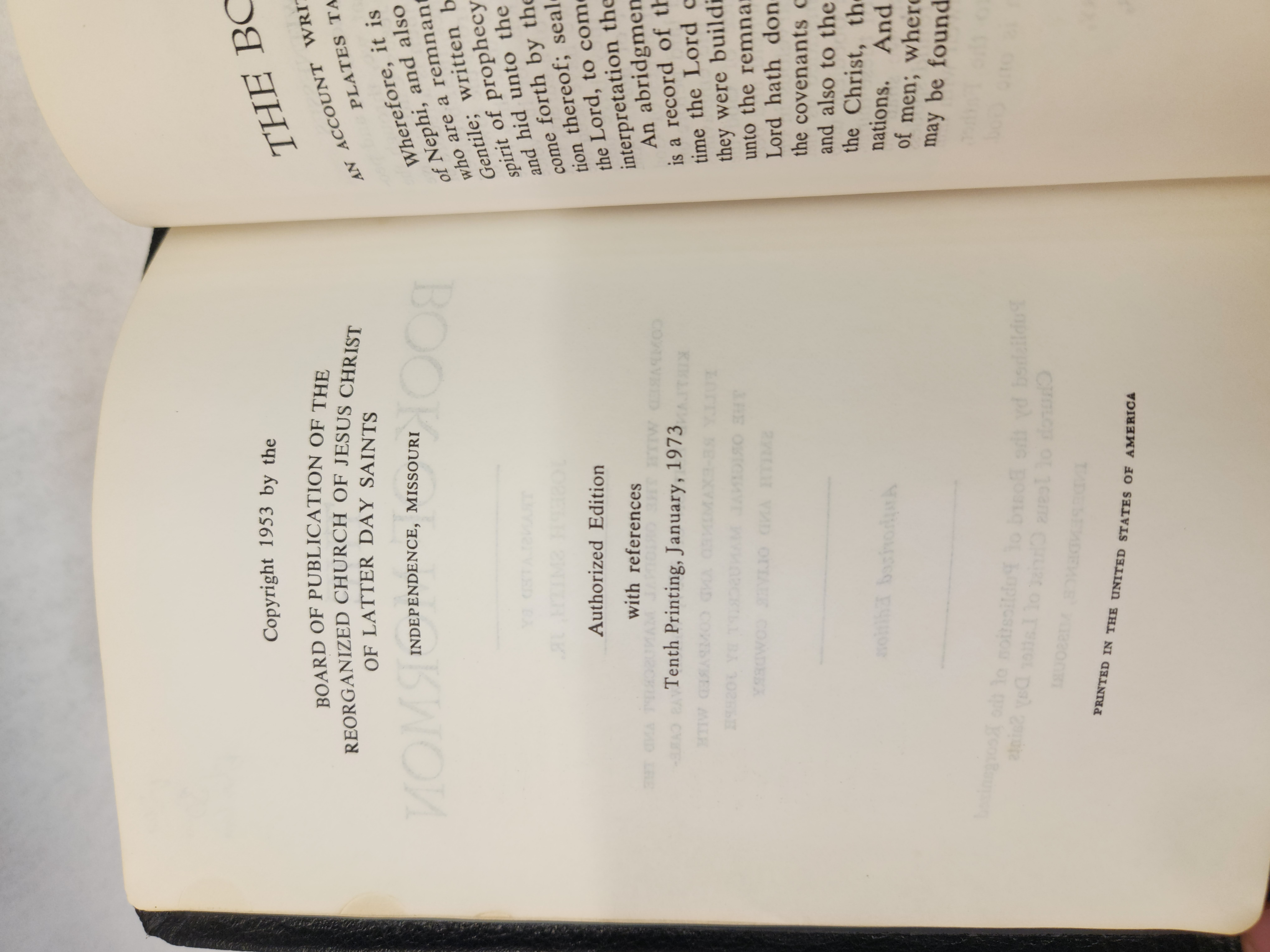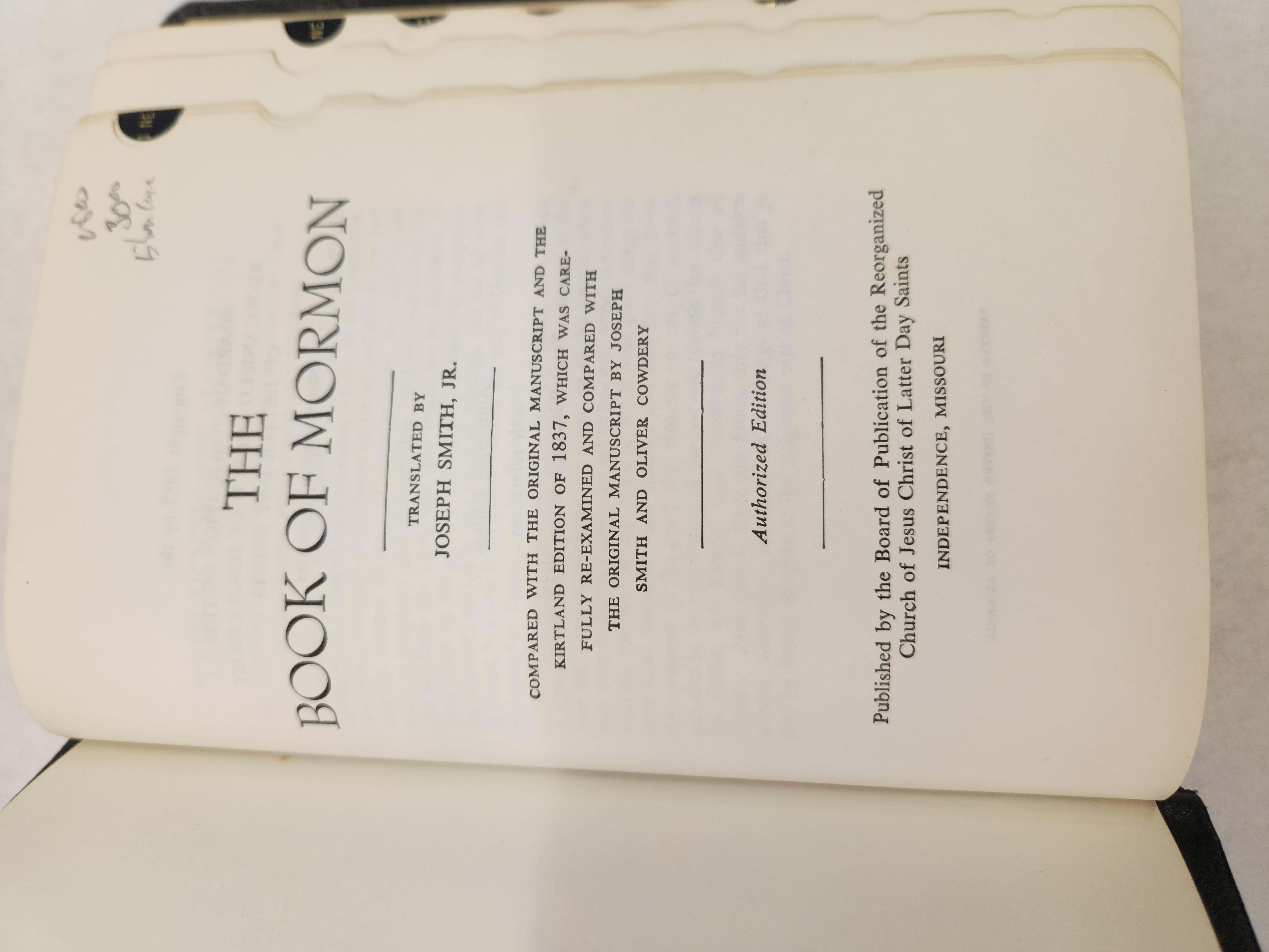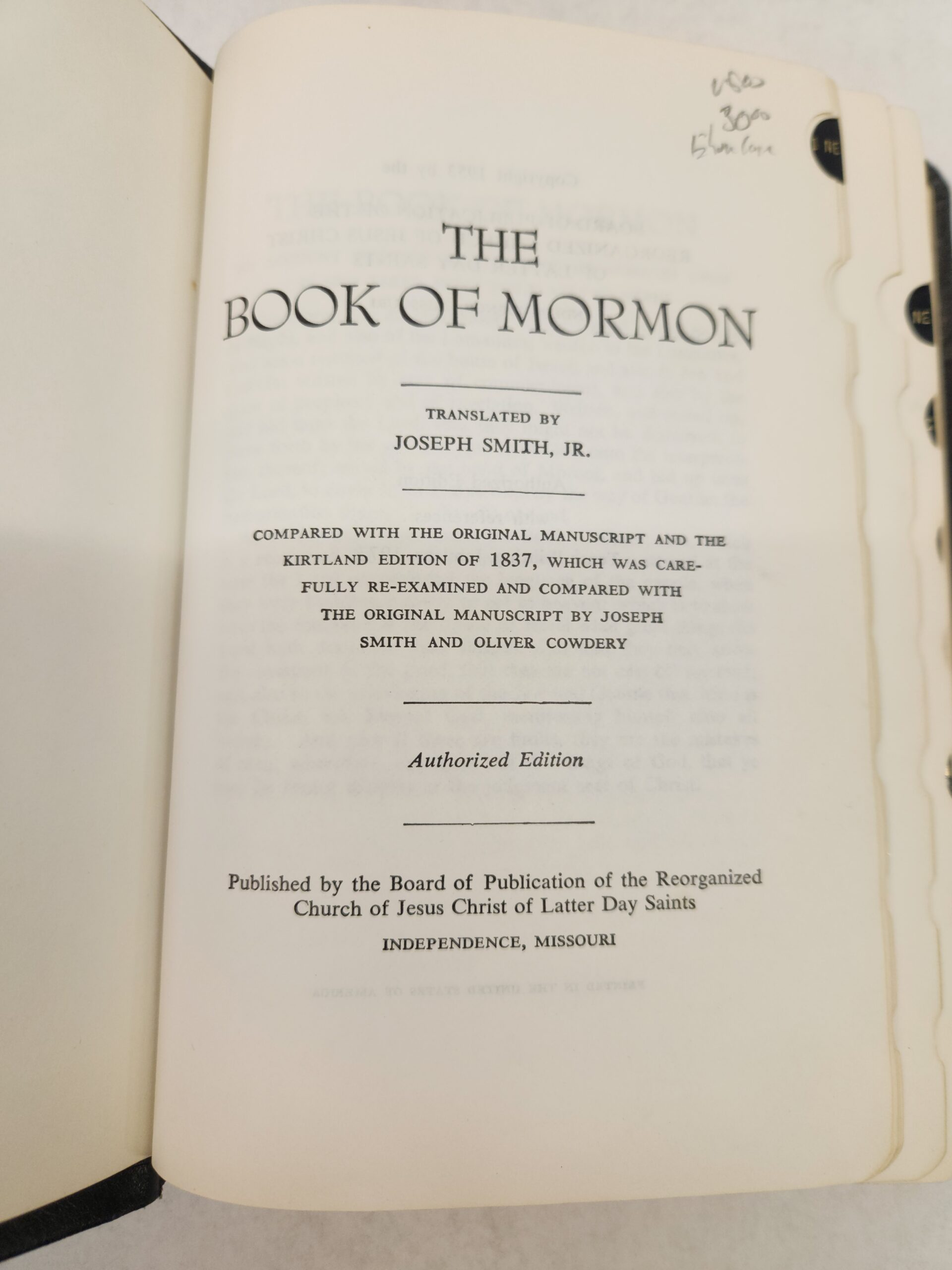 Book of Mormon (1973, RLDS, Black Faux Leather) There is underlining and written in pen annotations throughout the book (see pics in gallery for example). Corners and edges show some shelf wear with bends and scuff marks. Front cover has some smudge marks. Spine is warped slightly so does not rest straight when on flat surface (see pic in gallery). Binding is good. One book tap is missing (see pic in gallery).