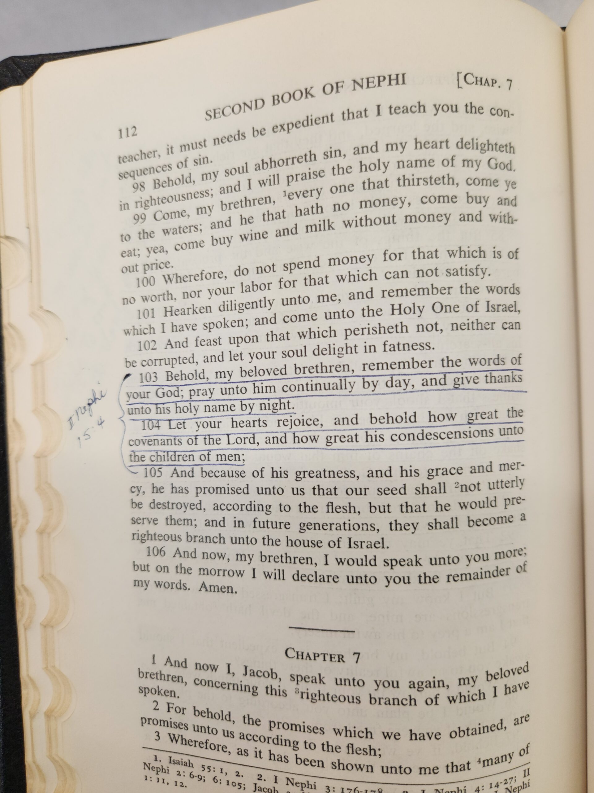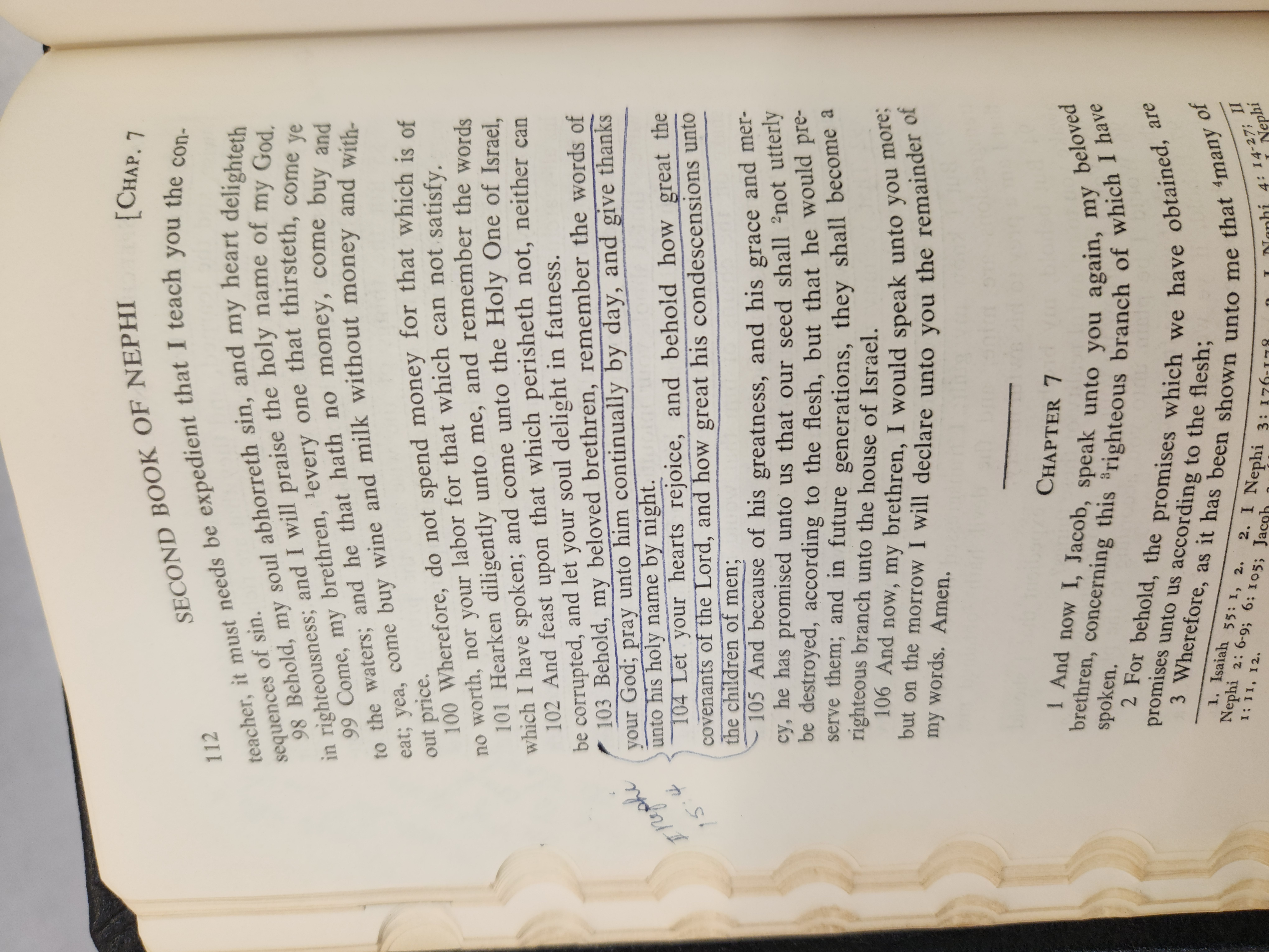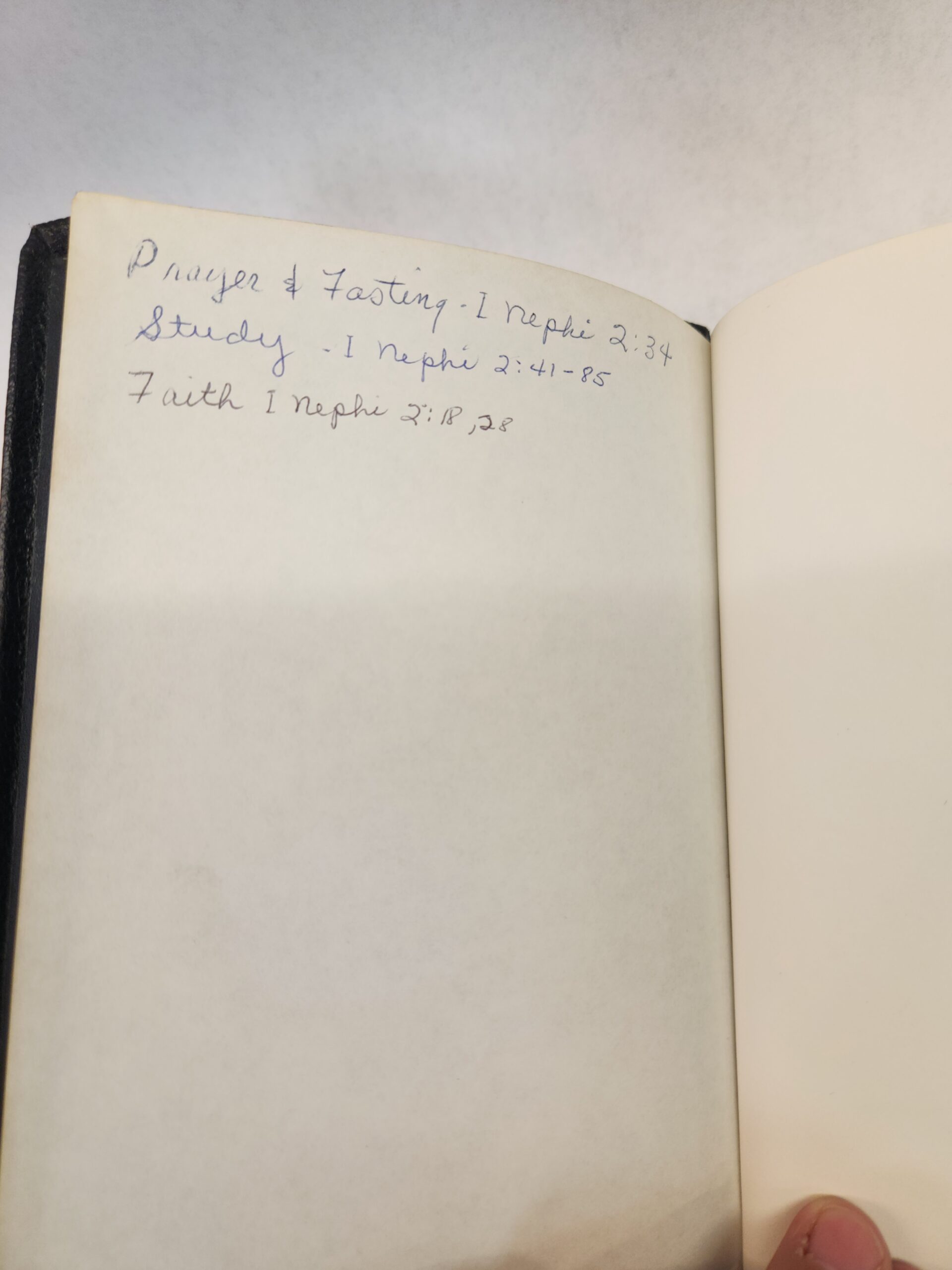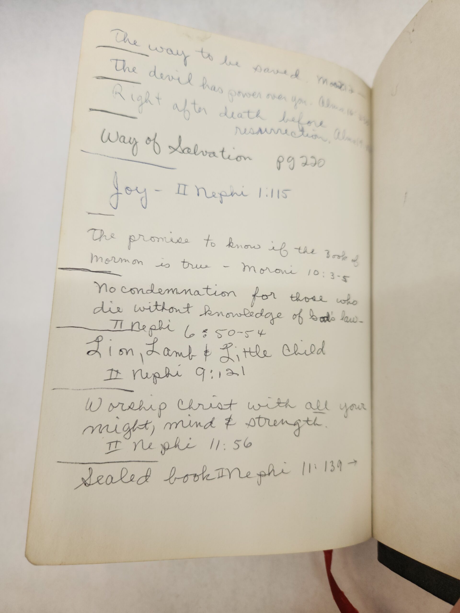 Book of Mormon (1973, RLDS, Black Faux Leather) There is underlining and written in pen annotations throughout the book (see pics in gallery for example). Corners and edges show some shelf wear with bends and scuff marks. Front cover has some smudge marks. Spine is warped slightly so does not rest straight when on flat surface (see pic in gallery). Binding is good. One book tap is missing (see pic in gallery).