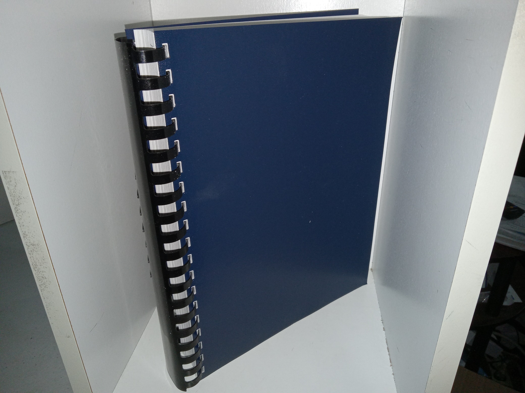 Good condition, large, thick, dark blue softcover with no titles printed on the covers, and with a black comb binding. The covers have some scuff marks, and some residue. The first page has writing in pencil, and eraser marks. Text throughout is clean, clear, and legible.