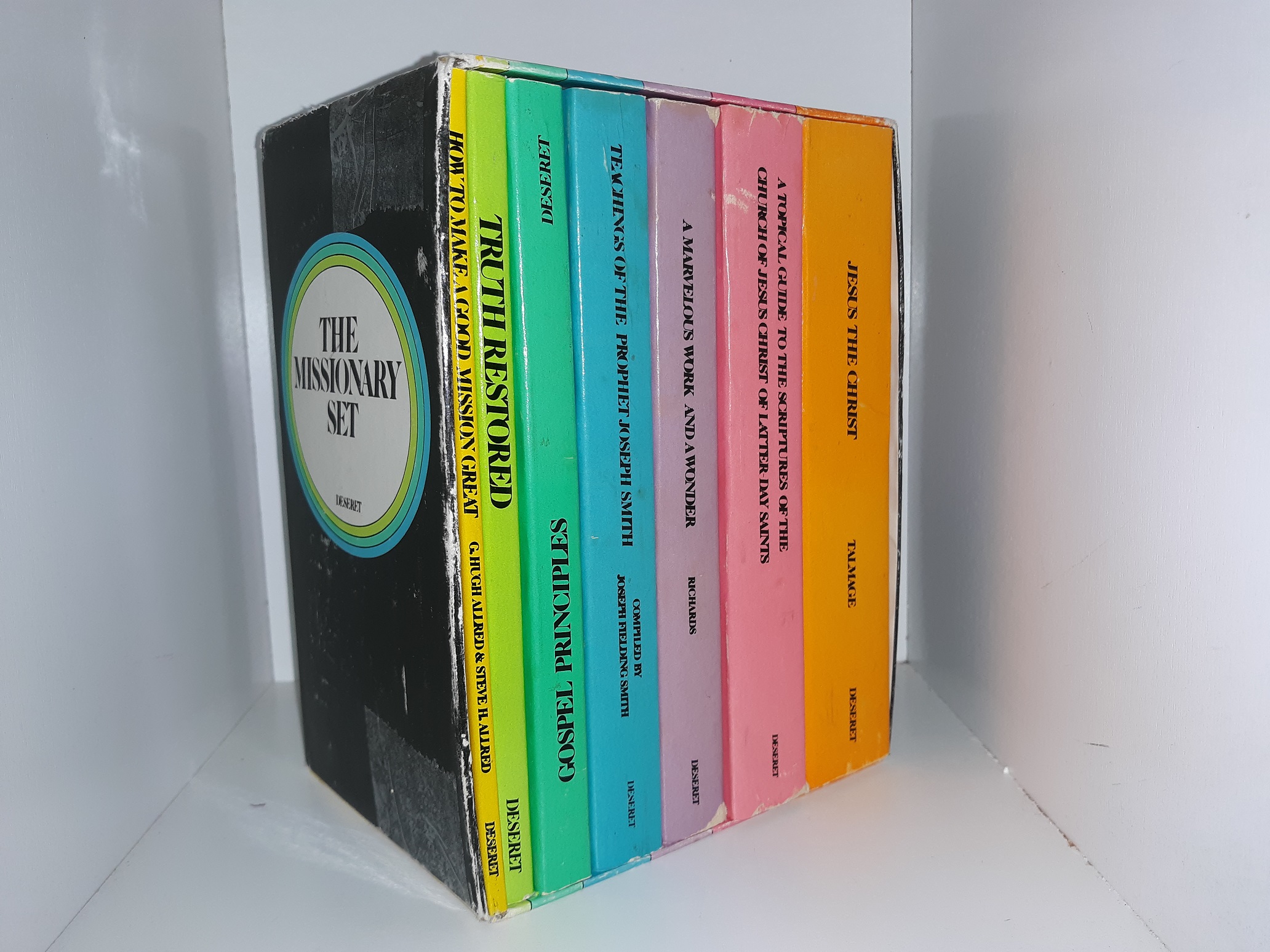 Good condition set of 7 softcovers kept within their original slip-box. The box has fading, scuffs, adhesive residue, some tape, and some small tears. The books have some minor creasing, scuffs, fading, some small wrinkles, and some small tears at the corners and edges. The text throughout each book is clean, clear, and legible.