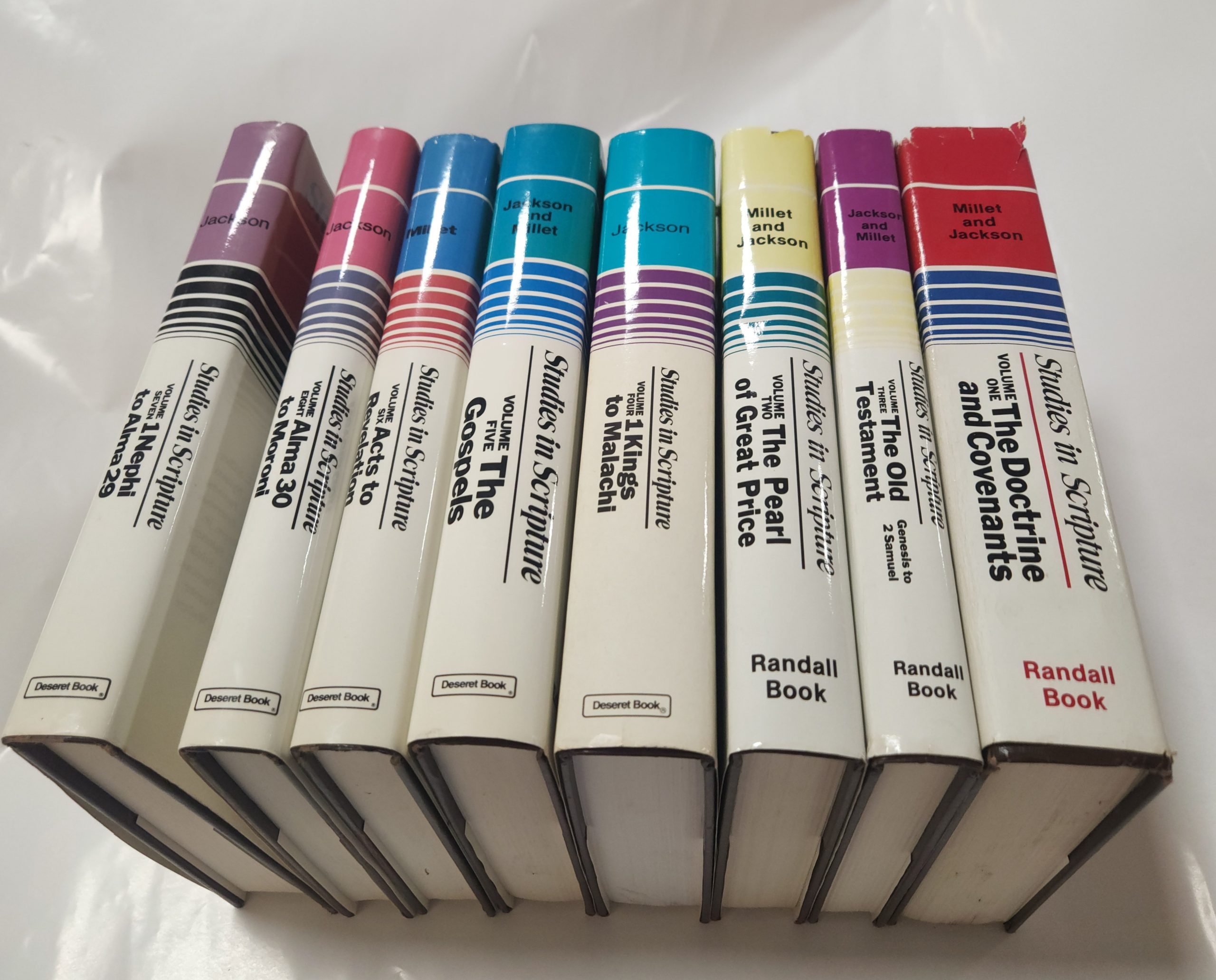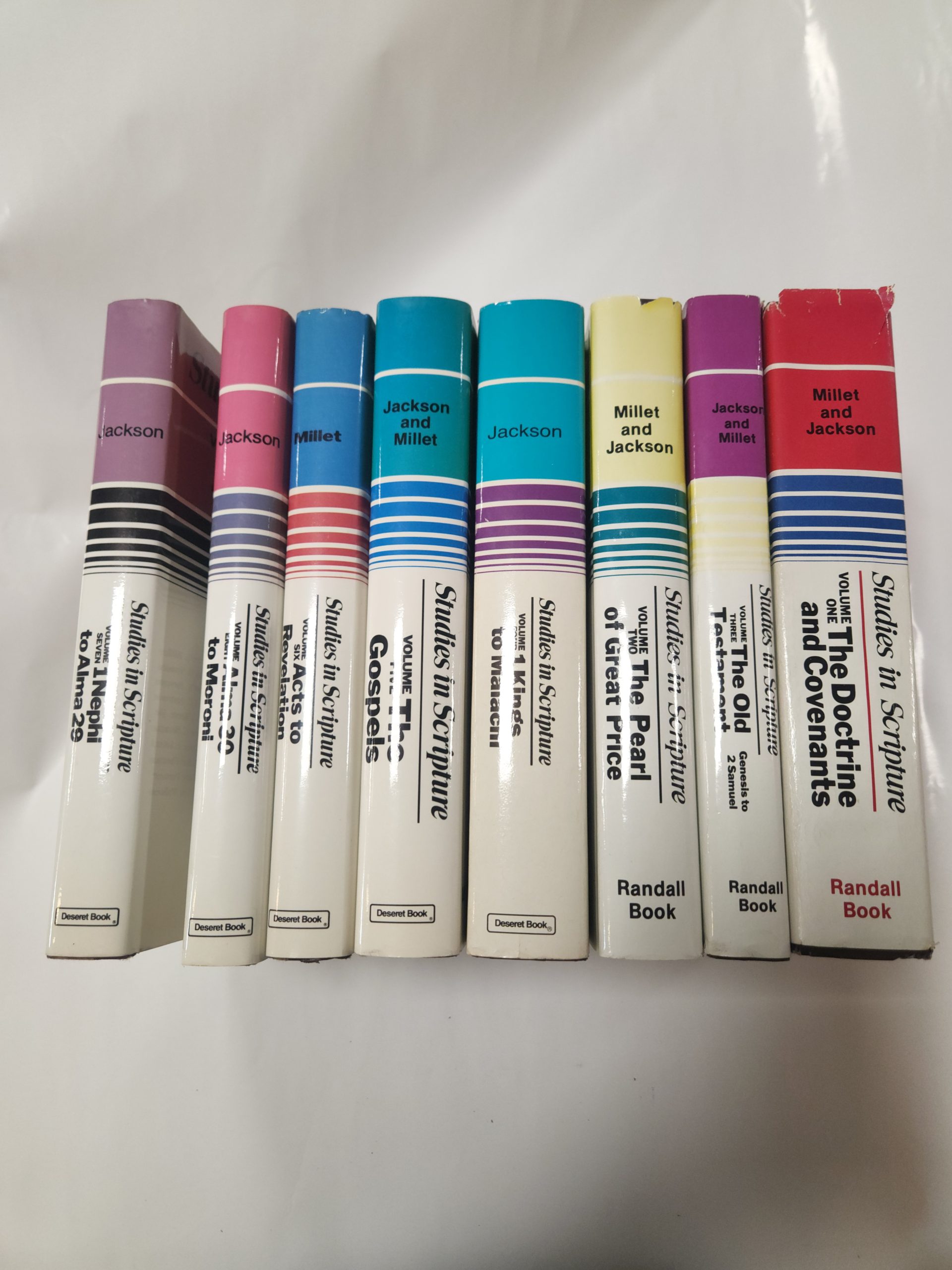 Studies in Scriptures, 8 vol. set (hardcover + jacket, inscription and signature, vol. 1-6, 8 first printing, vol. 7 second printing). Vol. 1-3, 5-6 has editors signature and an inscription. No signature or inscription on Vol. 4, 7-8. A few small tearing and creases around edges of jacket. Several deep dings on jacket along left side. Vol. 1 has the most wear on jacket with several bigger tears along the upper edges. No markings on pages. Above Case 3