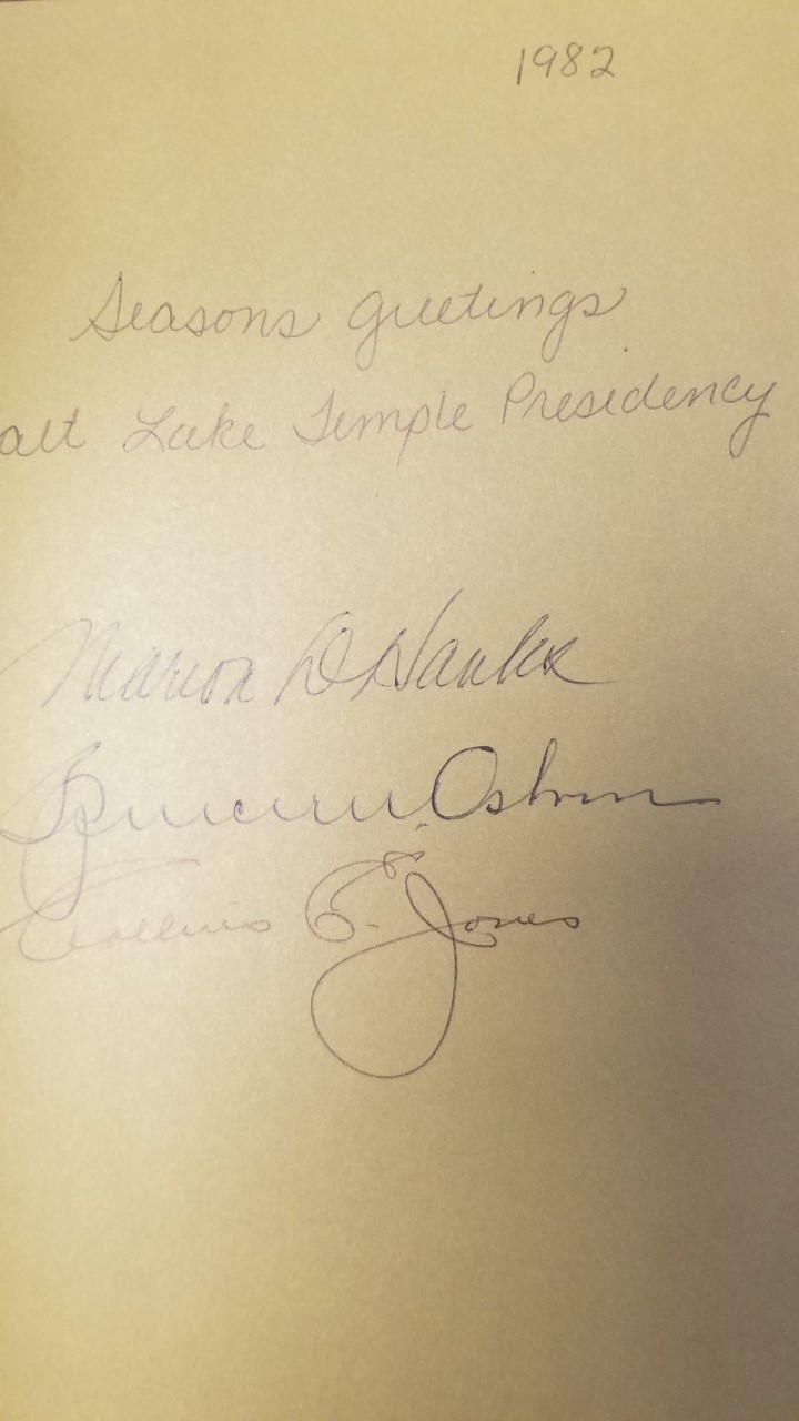 The book is inscribed and signed by Elder Marion D. Hanks and his two counselors inside the front cover.