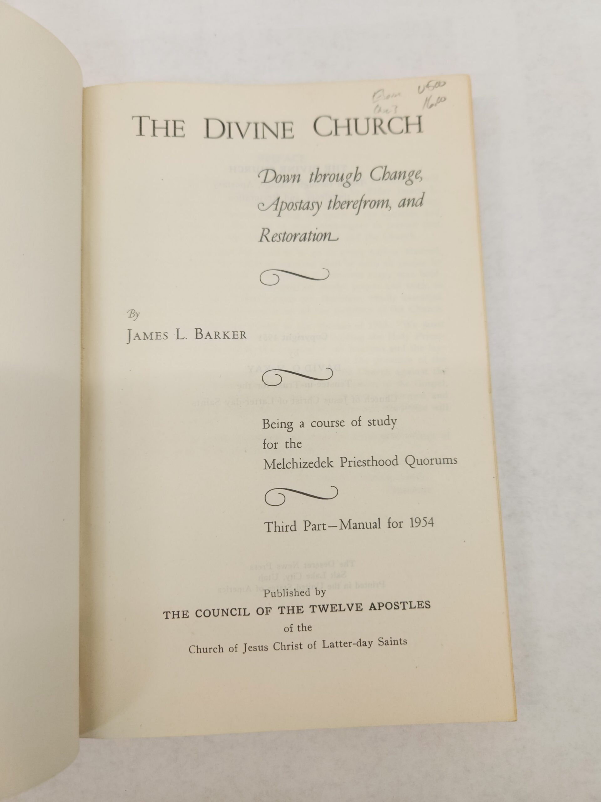 The Divine Church:: Down through change, Apostasy therefrom, and Restoration, Being a Course of Study for the Melchizedek Priesthood Quorums, Third Part – Manual for 1954 (1951, Paperback) No marks/writing on pages, except for last blank page at end of book (see pic in gallery). Corner and edges show some shelf wear. Binding is good. There is a selling sticker on the back cover.